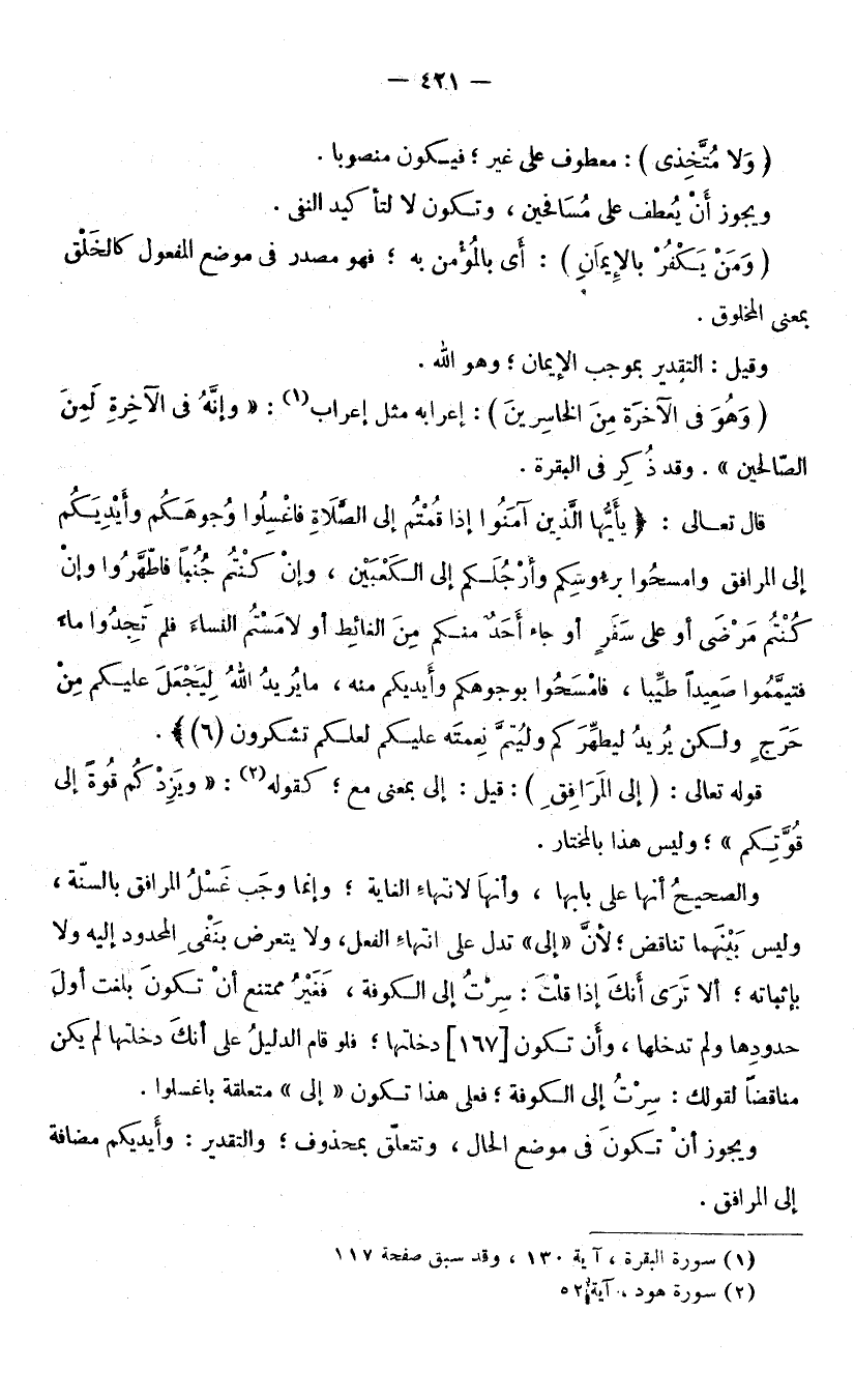 قَوْلُهُ تَعَالَى: (إِلَى الْمَرَافِقِ) : قِيلَ: «إِلَى» بِمَعْنَى «مَعَ» كَقَوْلِهِ: وَيَزِدْكُمْ قُوَّةً إِلَى قُوَّتِكُمْ، وَلَيْسَ هَذَا الْمُخْتَارَ، وَالصَّحِيحُ أَنَّهَا عَلَى بَابِهَا، وَأَنَّهَا لِانْتِهَاءِ الْغَايَةِ، وَإِنَّمَا وَجَبَ غَسْلُ الْمَرَافِقِ بِالسُّنَّةِ، وَلَيْسَ بَيْنَهُمَا تَنَاقُضٌ؛ لِأَنَّ «إِلَى» تَدُلُّ عَلَى انْتِهَاءِ الْفِعْلِ، وَلَا يَتَعَرَّضُ بِنَفْيِ الْمَحْدُودِ إِلَيْهِ، وَلَا بِإِثْبَاتِهِ، أَلَا تَرَى أَنَّكَ إِذَا قُلْتَ: سِرْتُ إِلَى الْكُوفَةِ، فَغَيْرُ مُمْتَنِعٍ أَنْ تَكُونَ بَلَغْتَ أَوَّلَ حُدُودِهَا، وَلَمْ تَدْخُلْهَا، وَأَنْ تَكُونَ دَخَلْتَهَا، فَلَوْ قَامَ الدَّلِيلُ عَلَى أَنَّكَ دَخَلْتَهَا، لَمْ يَكُنْ مُنَاقِضًا لِقَوْلِكَ: سِرْتُ إِلَى الْكُوفَةِ، فَعَلَى هَذَا تَكُونُ «إِلَى» مُتَعَلِّقَةً بِـ «اغْسِلُوا» .