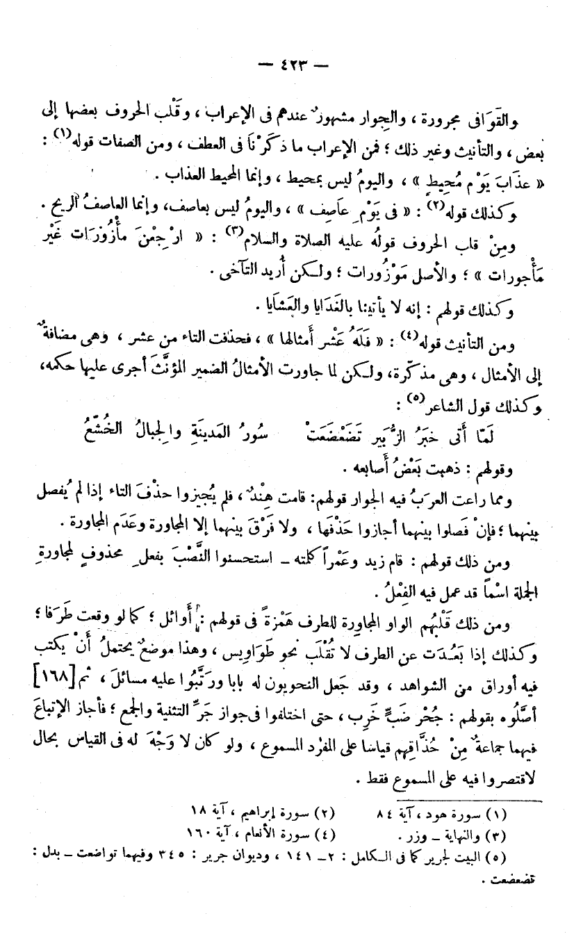 وَالْقَوَافِي مَجْرُورَةٌ، وَالْجِوَارُ مَشْهُورٌ عِنْدَهُمْ فِي الْإِعْرَابِ، وَقَلْبِ الْحُرُوفِ بِبَعْضِهَا إِلَى بَعْضٍ وَالتَّأْنِيثِ وَغَيْرِ ذَلِكَ. فَمِنَ الْإِعْرَابِ مَا ذَكَرْنَا فِي الْعَطْفِ، وَمِنَ الصِّفَاتِ قَوْلُهُ: (عَذَابَ يَوْمٍ مُحِيطٍ) [هُودٍ: 84] وَالْيَوْمُ لَيْسَ بِمُحِيطٍ، وَإِنَّمَا الْمُحِيطُ الْعَذَابُ.