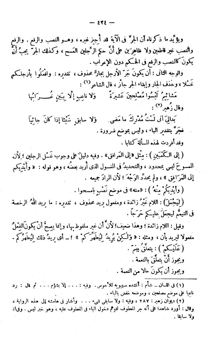 وَيُؤَيِّدُ مَا ذَكَرْنَاهُ أَنَّ الْجَرَّ فِي الْآيَةِ قَدْ أُجِيزَ غَيْرُهُ، وَهُوَ النَّصْبُ، وَالرَّفْعُ وَالنَّصْبُ غَيْرُ قَاطِعَيْنِ، وَلَا ظَاهِرَيْنِ عَلَى أَنَّ حُكْمَ الرِّجْلَيْنِ الْمَسْحُ، وَكَذَلِكَ الْجَرُّ يَجِبُ أَنْ يَكُونَ كَالنَّصْبِ وَالرَّفْعُ فِي الْحُكْمِ دُونَ الْإِعْرَابِ. وَالْوَجْهُ الثَّانِي: أَنْ يَكُونَ جَرُّ الْأَرْجُلِ بِجَارٍّ مَحْذُوفٍ تَقْدِيرُهُ: وَافْعَلُوا بِأَرْجُلِكُمْ غَسْلًا، وَحَذْفُ الْجَارِّ وَإِبْقَاءُ الْجَرِّ جَائِزٌ، قَالَ الشَّاعِرُ: