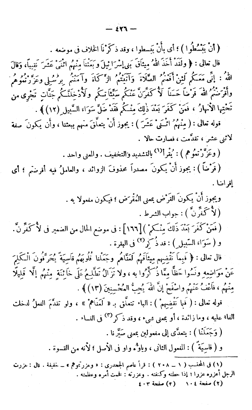 قَوْلُهُ تَعَالَى: (مِنْهُمُ اثْنَيْ عَشَرَ) : يَجُوزُ أَنْ يَتَعَلَّقَ مِنْهُمْ بِبَعَثْنَا، وَأَنْ يَكُونَ صِفَةً لِاثْنَيْ عَشَرَ، تَقَدَّمَتْ، فَصَارَتْ حَالًا. (وَعَزَّرْتُمُوهُمْ) : يُقْرَأُ بِالتَّشْدِيدِ وَالتَّخْفِيفِ، وَالْمَعْنَى وَاحِدٌ. (قَرْضًا) : يَجُوزُ أَنْ يَكُونَ مَصْدَرًا مَحْذُوفَ الزَّوَائِدِ، وَالْعَامِلُ فِيهِ أَقْرَضْتُمْ؛ أَيْ: إِقْرَاضًا، وَيَجُوزُ أَنْ يَكُونَ الْقَرْضُ بِمَعْنَى الْمُقْرَضِ، فَيَكُونُ مَفْعُولًا بِهِ. (لَأُكَفِّرَنَّ) : جَوَابُ الشَّرْطِ. (فَمَنْ كَفَرَ بَعْدَ ذَلِكَ مِنْكُمْ) : فِي مَوْضِعِ الْحَالِ مِنَ الضَّمِيرِ فِي لَأُكَفِّرَنَّ. وَ (سَوَاءَ السَّبِيلِ) : قَدْ ذُكِرَ فِي الْبَقَرَةِ.