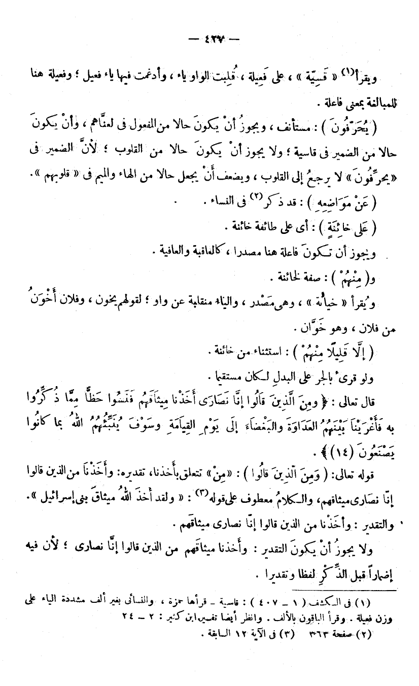 وَيُقْرَأُ «قَسِيَّةً» عَلَى فَعِيلَةٍ، قُلِبَتِ الْوَاوُ يَاءً وَأُدْغِمَتْ فِيهَا يَاءُ فَعِيلٍ، وَفَعِيلَةٌ هُنَا لِلْمُبَالَغَةِ بِمَعْنَى فَاعِلَةٍ. (يُحَرِّفُونَ) : مُسْتَأْنَفٌ، وَيَجُوزُ أَنْ يَكُونَ حَالًا مِنَ الْمَفْعُولِ فِي لَعَنَّاهُمْ، وَأَنْ يَكُونَ حَالًا مِنَ الضَّمِيرِ فِي قَاسِيَةٍ. وَلَا يَجُوزُ أَنْ يَكُونَ حَالًا مِنَ الْقُلُوبِ؛ لِأَنَّ الضَّمِيرَ فِي يُحَرِّفُونَ لَا يَرْجِعُ إِلَى الْقُلُوبِ، وَيَضْعُفُ أَنْ يُجْعَلَ حَالًا مِنَ الْهَاءِ وَالْمِيمِ فِي «قُلُوبِهِمْ» . (عَنْ مَوَاضِعِهِ) : قَدْ ذُكِرَ فِي النِّسَاءِ. (عَلَى خَائِنَةٍ) : أَيْ عَلَى طَائِفَةٍ خَائِنَةٍ، وَيَجُوزُ أَنْ تَكُونَ فَاعِلَةٌ هُنَا مَصْدَرًا كَالْعَاقِبَةِ وَالْعَافِيَةِ. وَ (مِنْهُمْ) : صِفَةٌ لِخَائِنَةٍ. وَيُقْرَأُ: «خِيَانَةٍ» وَهِيَ مَصْدَرٌ، وَالْيَاءُ مُنْقَلِبَةٌ عَنْ وَاوٍ؛ لِقَوْلِهِمْ يَخُونُ، وَفُلَانٌ أَخْوَنُ مِنْ فُلَانٍ، وَهُوَ خَوَّانٌ. (إِلَّا قَلِيلًا مِنْهُمْ) : اسْتِثْنَاءٌ مِنْ خَائِنَةٍ، وَلَوْ قُرِئَ بِالْجَرِّ عَلَى الْبَدَلِ لَكَانَ مُسْتَقِيمًا.