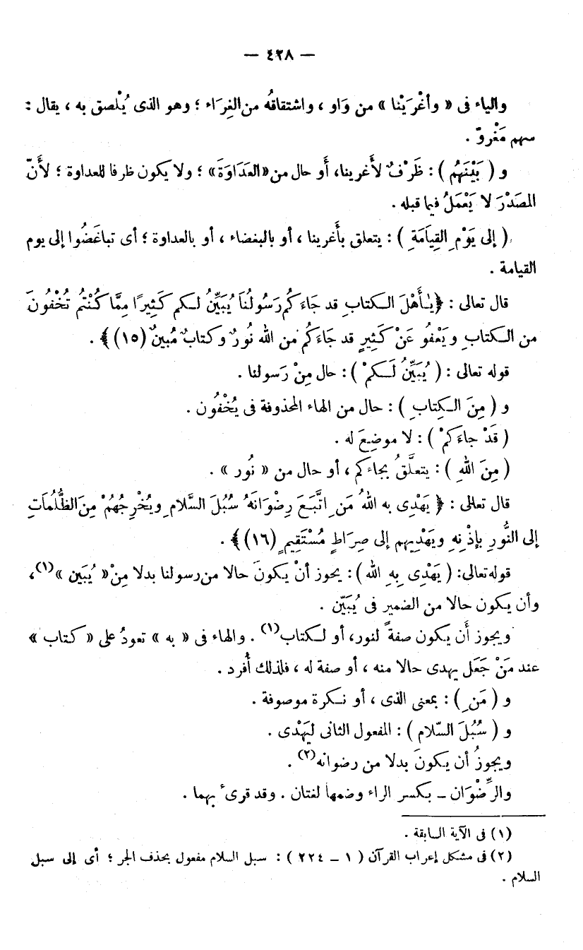 قَوْلُهُ تَعَالَى: (يَهْدِي بِهِ اللَّهُ) : يَجُوزُ أَنْ يَكُونَ حَالًا مِنْ «رَسُولُنَا» بَدَلًا مِنْ «يُبَيِّنُ» ، وَأَنْ يَكُونَ حَالًا مِنَ الضَّمِيرِ فِي «يُبَيِّنُ» ، وَيَجُوزُ أَنْ يَكُونَ صِفَةً لِـ «نُورٌ» أَوْ لِـ «كِتَابٌ» ، وَالْهَاءُ فِي بِهِ تَعُودُ عَلَى مَنْ جَعَلَ «يَهْدِي» حَالًا مِنْهُ، أَوْ صِفَةً لَهُ، فَلِذَلِكَ أُفْرِدَ. وَ (مَنْ) : بِمَعْنَى الَّذِي، أَوْ نَكِرَةٌ مَوْصُوفَةٌ. وَ (سُبُلَ السَّلَامِ) : الْمَفْعُولُ الثَّانِي لِـ «يَهْدِي» ، وَيَجُوزُ أَنْ يَكُونَ بَدَلًا مِنْ رِضْوَانِهِ، وَالرِّضْوَانُ بِكَسْرِ الرَّاءِ وَضَمِّهَا لُغَتَانِ، وَقَدْ قُرِئَ بِهِمَا، وَ «