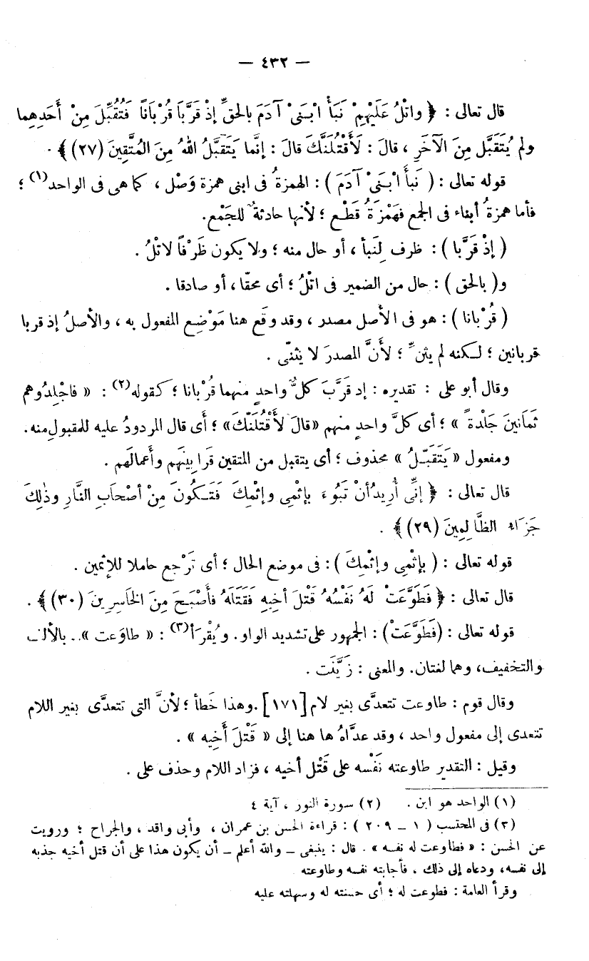 قَوْلُهُ تَعَالَى: (نَبَأَ ابْنَيْ آدَمَ) : الْهَمْزَةُ فِي «ابْنَيْ» هَمْزَةُ وَصْلٍ كَمَا هِيَ فِي الْوَاحِدِ، فَأَمَّا هَمْزَةُ أَبْنَاءٍ فِي الْجَمْعِ فَهَمْزَةُ قَطْعٍ؛ لِأَنَّهَا حَادِثَةٌ لِلْجَمْعِ. (إِذْ قَرَّبَا) : ظَرْفٌ لِـ «نَبَأَ» ، أَوْ حَالٌ مِنْهُ، وَلَا يَكُونُ ظَرْفًا لِـ «اتْلُ» ، وَبِالْحَقِّ حَالٌ مِنَ الضَّمِيرِ فِي «اتْلُ» ؛ أَيْ: مُحِقًّا أَوْ صَادِقًا. (قُرْبَانًا) : هُوَ فِي الْأَصْلِ مَصْدَرٌ، وَقَدْ وَقَعَ هُنَا مَوْضِعَ الْمَفْعُولِ بِهِ، وَالْأَصْلُ إِذْ قَرَّبَا قُرْبَانَيْنِ، لَكِنَّهُ لَمْ يُثَنَّ؛ لِأَنَّ الْمَصْدَرَ لَا يُثَنَّى. وَقَالَ أَبُو عَلِيٍّ: تَقْدِيرُهُ: إِذْ قَرَّبَ كُلُّ وَاحِدٍ مِنْهُمَا قُرْبَانًا؛ كَقَوْلِهِ: (فَاجْلِدُوهُمْ ثَمَانِينَ جَلْدَةً) [النُّورِ: 4] ؛ أَيْ: كُلَّ وَاحِدٍ مِنْهُمْ. (قَالَ لَأَقْتُلَنَّكَ) ؛ أَيْ: قَالَ الْمَرْدُودُ عَلَيْهِ لِلْمَقْبُولِ مِنْهُ. وَمَفْعُولُ (يَتَقَبَّلُ) مَحْذُوفٌ؛ أَيْ: يَتَقَبَّلُ مِنَ الْمُتَّقِينَ قَرَابِينَهُمْ وَأَعْمَالَهُمْ.