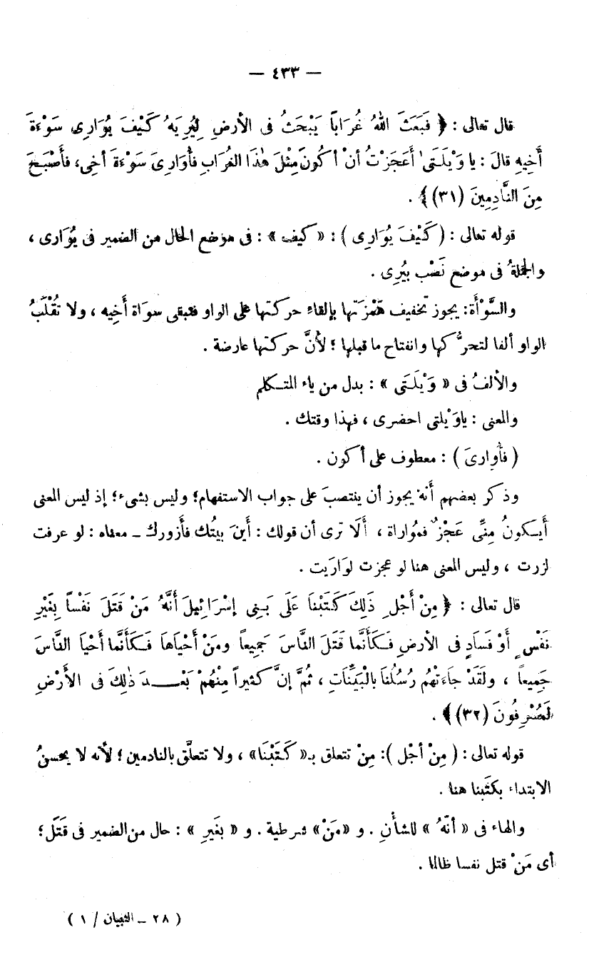 قَوْلُهُ تَعَالَى: (كَيْفَ يُوَارِي) : كَيْفَ فِي مَوْضِعِ الْحَالِ مِنَ الضَّمِيرِ فِي يُوَارِي، وَالْجُمْلَةُ فِي مَوْضِعِ نَصْبٍ بِيُرِي، وَالسَّوْأَةُ يَجُوزُ تَخْفِيفُ هَمْزَتِهَا بِإِلْقَاءِ حَرَكَتِهَا عَلَى الْوَاوِ، فَتَبْقَى سَوَاةُ أَخِيهِ، وَلَا تُقْلَبُ الْوَاوُ أَلِفًا، لِتَحَرُّكِهَا وَانْفِتَاحِ مَا قَبْلَهَا؛ لِأَنَّ حَرَكَتَهَا عَارِضَةٌ، وَالْأَلِفُ فِي (وَيْلَتَى) : بَدَلٌ مِنْ يَاءِ الْمُتَكَلِّمِ وَالْمَعْنَى يَا وَيْلَتِي احْضُرِي، فَهَذَا وَقْتُكِ. (فَأُوَارِيَ) : مَعْطُوفٌ عَلَى «أَكُونَ» ، وَذَكَرَ بَعْضُهُمْ أَنَّهُ يَجُوزُ أَنْ يَنْتَصِبَ عَلَى جَوَابِ الِاسْتِفْهَامِ، وَلَيْسَ بِشَيْءٍ، إِذْ لَيْسَ الْمَعْنَى أَيَكُونُ مِنِّي عَجْزٌ فَمُوَارَاةٌ؛ أَلَا تَرَى أَنَّ قَوْلَكَ: أَيْنَ بَيْتُكَ فَأَزُورَكَ، مَعْنَاهُ لَوْ عَرَفْتُ لَزُرْتُ، وَلَيْسَ الْمَعْنَى هُنَا لَوْ عَجَزْتُ لَوَارَيْتُ.