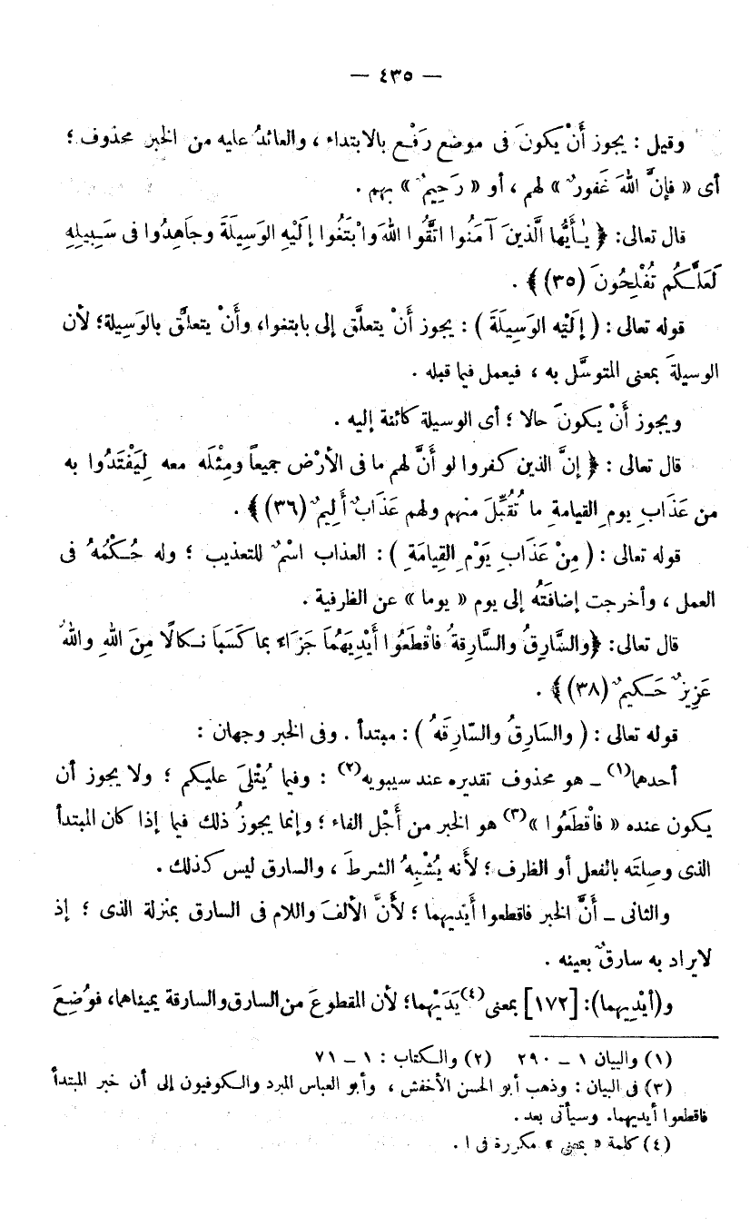 تَقْدِيرُهُ عِنْدَ سِيبَوَيْهِ: وَفِيمَا يُتْلَى عَلَيْكُمْ، وَلَا يَجُوزُ أَنْ يَكُونَ عِنْدَهُ «فَاقْطَعُوا» هُوَ الْخَبَرُ مِنْ أَجْلِ الْفَاءِ، وَإِنَّمَا يَجُوزُ ذَلِكَ فِيمَا إِذَا كَانَ الْمُبْتَدَأُ الَّذِي وَصَلْتَهُ بِالْفِعْلِ، أَوِ الظَّرْفِ؛ لِأَنَّهُ يُشْبِهُ الشَّرْطَ. وَالسَّارِقُ لَيْسَ كَذَلِكَ. وَالثَّانِي: الْخَبَرُ فَاقْطَعُوا أَيْدِيَهُمَا؛ لِأَنَّ الْأَلِفَ وَاللَّامَ فِي السَّارِقِ بِمَنْزِلَةِ الَّذِي لَا يُرَادُ بِهِ سَارِقٌ بِعَيْنِهِ. (وَأَيْدِيَهُمَا) : بِمَعْنَى يَدَيْهِمَا؛ لِأَنَّ الْمَقْطُوعَ مِنَ السَّارِقِ وَالسَّارِقَةِ يَمِينَاهُمْ، فَوُضِعَ