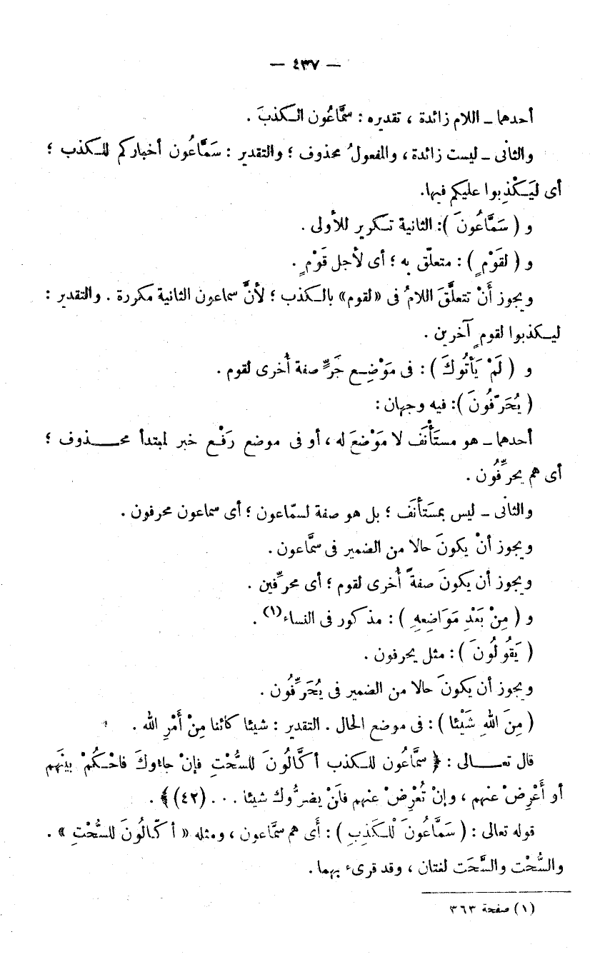 أَحَدُهُمَا: اللَّامُ زَائِدَةٌ تَقْدِيرُهُ: سَمَّاعُونَ الْكَذِبَ. وَالثَّانِي: لَيْسَتْ زَائِدَةً، وَالْمَفْعُولُ مَحْذُوفٌ، وَالتَّقْدِيرُ: سَمَّاعُونَ أَخْبَارِكُمْ لِلْكَذِبِ؛ أَيْ: لِيَكْذِبُوا عَلَيْكُمْ فِيهَا. وَ (سَمَّاعُونَ) : الثَّانِيَةُ تَكْرِيرًا لِلْأُولَى. وَ (لِقَوْمٍ) : مُتَعَلِّقٌ بِهِ؛ أَيْ: لِأَجْلِ قَوْمٍ، وَيَجُوزُ أَنْ تَتَعَلَّقَ اللَّامُ فِي لِقَوْمٍ بِالْكَذِبِ؛ لِأَنَّ سَمَّاعُونَ الثَّانِيَةَ مُكَرَّرَةٌ، وَالتَّقْدِيرُ: لِيَكْذِبُوا لِقَوْمٍ آخَرِينَ، وَ (لَمْ يَأْتُوكَ) : فِي مَوْضِعِ جَرٍّ صِفَةٌ أُخْرَى لِقَوْمٍ. (يُحَرِّفُونَ) : فِيهِ وَجْهَانِ: أَحَدُهُمَا: هُوَ مُسْتَأْنَفٌ لَا مَوْضِعَ لَهُ، أَوْ فِي مَوْضِعِ رَفْعِ