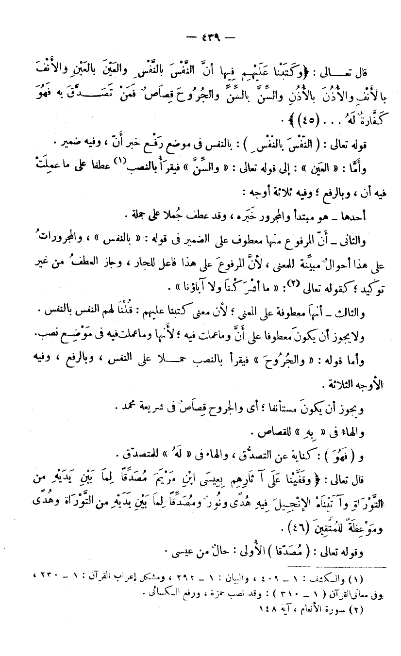 وَأَمَّا قَوْلُهُ: «وَالْجُرُوحَ» فَيُقْرَأُ بِالنَّصْبِ حَمْلًا عَلَى «النَّفْسَ» وَبِالرَّفْعِ وَفِيهِ الْأَوْجُهُ الثَّلَاثَةُ.
