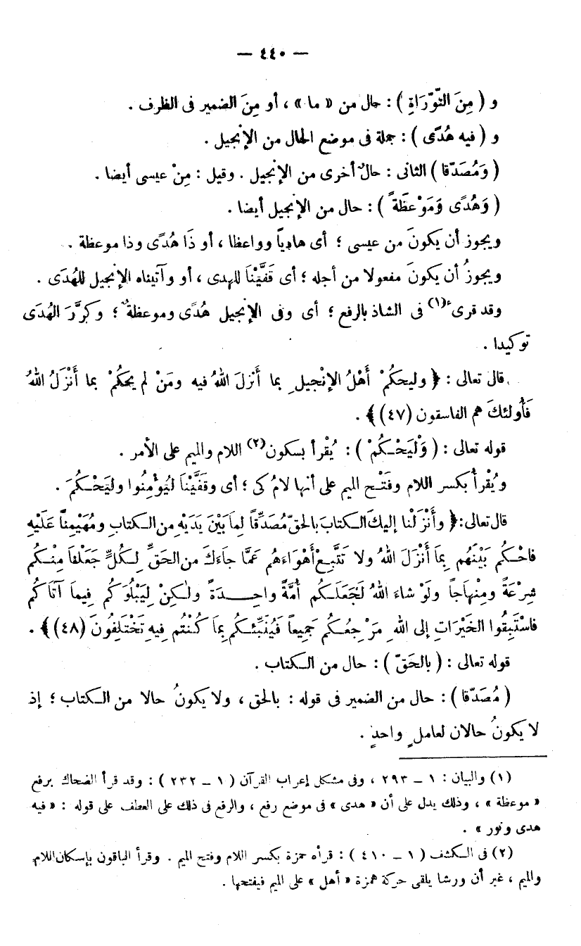 وَ (مِنَ التَّوْرَاةِ) : حَالٌ مِنْ «مَا» أَوْ مِنَ الضَّمِيرِ فِي الظَّرْفِ. وَ (فِيهِ هُدًى) : جُمْلَةٌ فِي مَوْضِعِ الْحَالِ مِنَ الْإِنْجِيلِ. (وَمُصَدِّقًا) الثَّانِي: حَالٌ أُخْرَى مِنَ الْإِنْجِيلِ، وَقِيلَ: مِنْ عِيسَى أَيْضًا. (وَهُدًى وَمَوْعِظَةً) : حَالٌ مِنَ الْإِنْجِيلِ أَيْضًا، وَيَجُوزُ أَنْ يَكُونَ مِنْ عِيسَى؛ أَيْ هَادِيًا وَوَاعِظًا، أَوْ ذَا هُدًى وَذَا مَوْعِظَةٍ. وَيَجُوزُ أَنْ يَكُونَ مَفْعُولًا مِنْ أَجْلِهِ؛ أَيْ: قَفَّيْنَا لِلْهُدَى، أَوْ وَآتَيْنَاهُ الْإِنْجِيلَ لِلْهُدَى. وَقَدْ قُرِئَ فِي الشَّاذِّ بِالرَّفْعِ؛ أَيْ: وَفِي الْإِنْجِيلِ هَدًى وَمَوْعِظَةً، وَكَرَّرَ الْهُدَى تَوْكِيدًا.