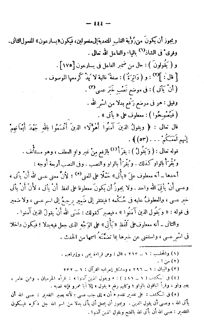 وَيَجُوزُ أَنْ يَكُونَ مِنْ رُؤْيَةِ الْقَلْبِ الْمُتَعَدِّيَةِ إِلَى مَفْعُولَيْنِ، فَيَكُونُ يُسَارِعُونَ الْمَفْعُولَ الثَّانِي، وَقُرِئَ فِي الشَّاذِّ بِالْيَاءِ، وَالْفَاعِلُ اللَّهُ تَعَالَى. وَ (يَقُولُونَ) : حَالٌ مِنْ ضَمِيرِ الْفَاعِلِ فِي يُسَارِعُونَ. وَ (دَائِرَةٌ) : صِفَةٌ غَالِبَةٌ لَا يُذْكَرُ مَعَهَا الْمَوْصُوفُ. (أَنْ يَأْتِيَ) : فِي مَوْضِعِ نَصْبٍ خَبَرُ عَسَى. وَقِيلَ: هُوَ فِي مَوْضِعِ رَفْعٍ بَدَلًا مِنِ اسْمِ اللَّهِ. (فَيُصْبِحُوا) : مَعْطُوفٌ عَلَى يَأْتِي.