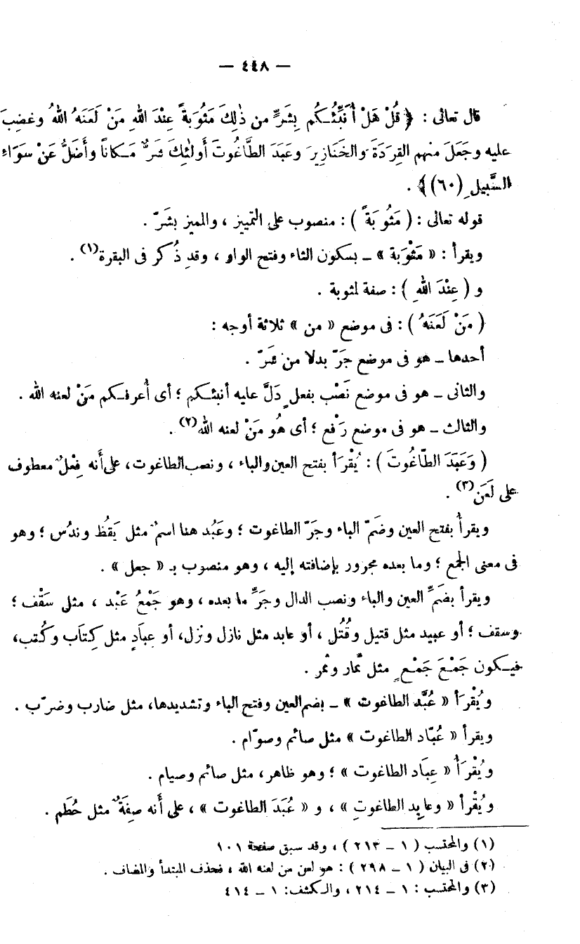 قَوْلُهُ تَعَالَى: (مَثُوبَةً) : مَنْصُوبٌ عَلَى التَّمْيِيزِ، وَالْمُمَيَّزُ بِشَرٍّ، وَيُقْرَأُ «مَثْوَبَةً» بِسُكُونِ الثَّاءِ وَفَتْحِ الْوَاوِ، وَقَدْ ذُكِرَ فِي الْبَقَرَةِ. وَ (عِنْدَ اللَّهِ) : صِفَةٌ لِـ «مَثُوبَةً» . (مَنْ لَعَنَهُ) : فِي مَوْضِعٍ مِنْ ثَلَاثَةِ أَوْجُهٍ: أَحَدُهَا: هُوَ فِي مَوْضِعِ جَرٍّ بَدَلًا مِنْ شَرٍّ. وَالثَّانِي: هُوَ فِي مَوْضِعِ نَصْبٍ بِفِعْلٍ دَلَّ عَلَيْهِ أُنَبِّئُكُمْ؛ أَيْ: أُعَرِّفُكُمْ مَنْ لَعَنَهُ اللَّهُ. وَالثَّالِثُ: هُوَ فِي مَوْضِعِ رَفْعٍ؛ أَيْ: هُوَ مَنْ لَعَنَهُ اللَّهُ.
