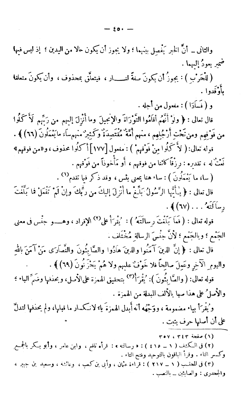 قَوْلُهُ تَعَالَى: (وَالصَّابِئُونَ) : يُقْرَأُ بِتَحْقِيقِ الْهَمْزَةِ عَلَى الْأَصْلِ، وَبِحَذْفِهَا وَضَمِّ الْبَاءِ، وَالْأَصْلُ عَلَى هَذَا صَبَا بِالْأَلِفِ الْمُبْدَلَةِ مِنَ الْهَمْزَةِ، وَيُقْرَأُ بِيَاءٍ مَضْمُومَةٍ، وَوَجْهُهُ أَنَّهُ أَبْدَلَ الْهَمْزَةَ؛ يَاءً لِانْكِسَارِ مَا قَبْلَهَا، وَلَمْ يَحْذِفْهَا لِتَدُلَّ عَلَى أَنَّ أَصْلَهَا حَرْفٌ يَثْبُتُ،