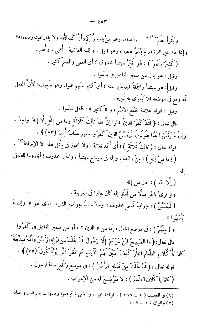 (إِلَّا إِلَهٌ) : بَدَلٌ مِنْ إِلَهٍ، وَلَوْ قُرِئَ بِالْجَرِّ بَدَلًا مِنْ لَفْظِ إِلَهٍ كَانَ جَائِزًا فِي الْعَرَبِيَّةِ. (لَيَمَسَّنَّ) : جَوَابُ قَسَمٍ مَحْذُوفٍ، وَسَدَّ مَسَدَّ جَوَابِ الشَّرْطِ الَّذِي هُوَ «وَإِنْ لَمْ يَنْتَهُوا» . وَ (مِنْهُمْ) : فِي مَوْضِعِ الْحَالِ، إِمَّا مِنَ الَّذِينَ، أَوْ مِنْ ضَمِيرِ الْفَاعِلِ فِي كَفَرُوا.