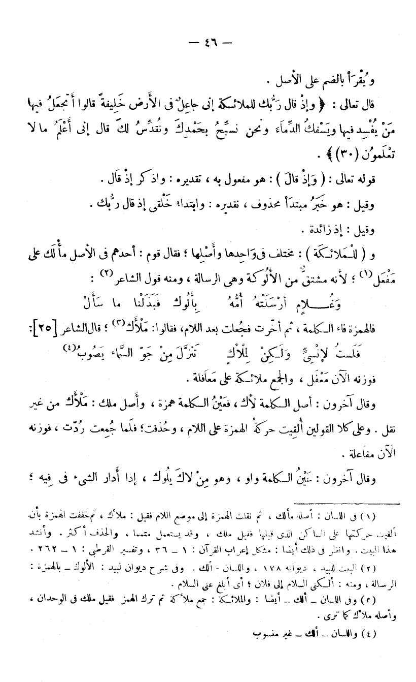 وَقِيلَ: هُوَ خَبَرُ مُبْتَدَأٍ مَحْذُوفٍ، تَقْدِيرُهُ: وَابْتِدَاءُ خَلْقِي إِذْ قَالَ رَبُّكَ. وَقِيلَ: زَائِدَةٌ وَ (لِلْمَلَائِكَةِ) : مُخْتَلَفٌ فِي وَاحِدِهَا وَأَصْلِهَا ; فَقَالَ قَوْمٌ أَحَدُهُمْ فِي الْأَصْلِ مَأْلَكٌ عَلَى مَفْعَلٍ ; لِأَنَّهُ مُشْتَقٌّ مِنَ الْأَلُوكَةِ وَهِيَ الرِّسَالَةُ، وَمِنْهُ قَوْلُ الشَّاعِرِ: