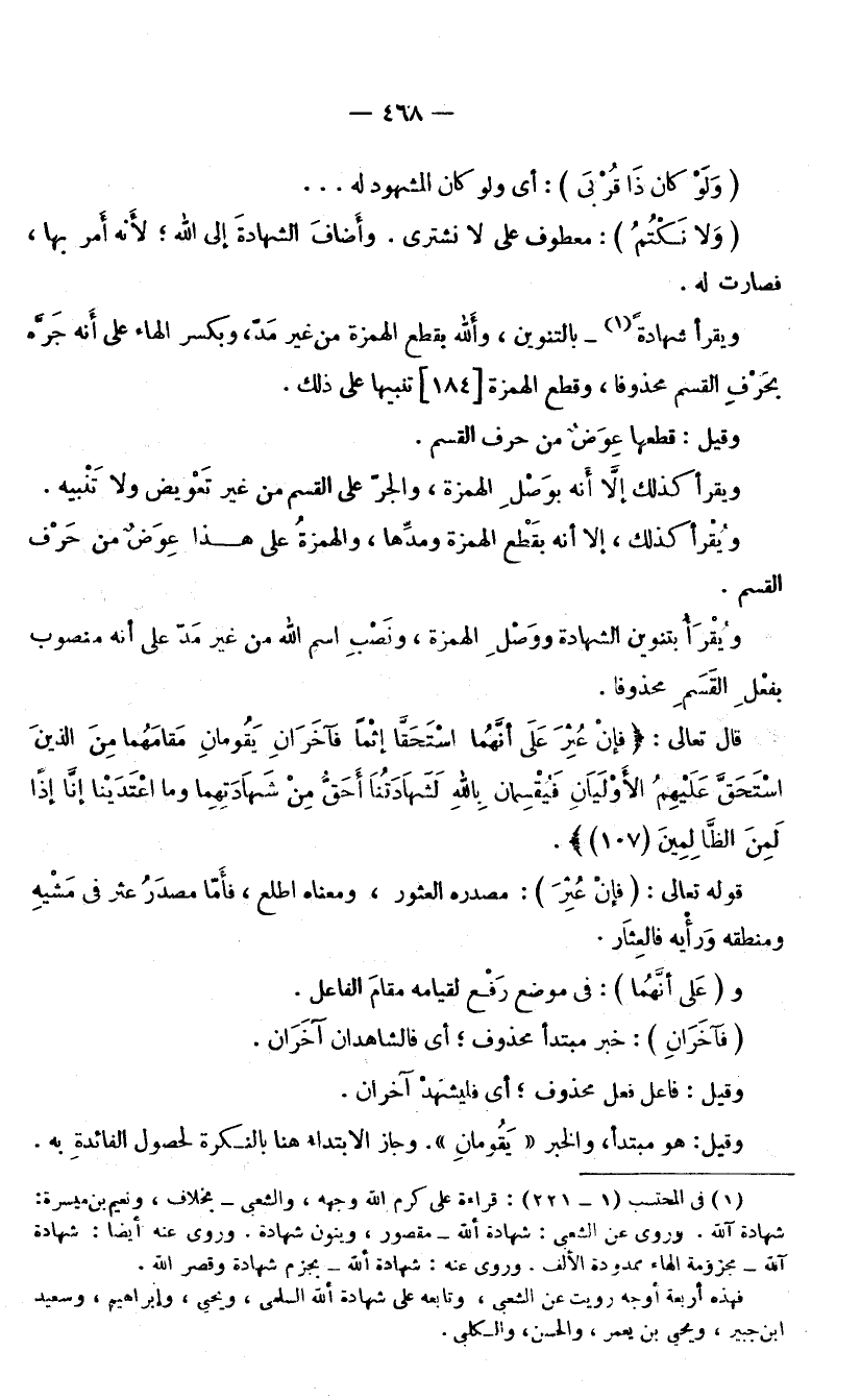 قَوْلُهُ تَعَالَى: (فَإِنْ عُثِرَ) : مَصْدَرُهُ الْعُثُورُ، وَمَعْنَاهُ اطُّلِعَ، فَأَمَّا مَصْدَرُ عَثَرَ فِي مَشْيِهِ وَمَنْطِقِهِ وَرَأْيِهِ فَالْعِثَارُ. وَ (عَلَى أَنَّهُمَا) : فِي مَوْضِعِ رَفْعٍ؛ لِقِيَامِهِ مَقَامَ الْفَاعِلِ. (فَآخَرَانِ) : خَبَرُ مُبْتَدَأٍ مَحْذُوفٍ؛ أَيْ: فَالشَّاهِدَانِ آخَرَانِ.