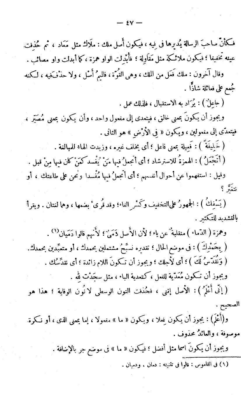 فَكَأَنَّ صَاحِبَ الرِّسَالَةِ يُدِيرُهَا فِي فِيهِ، فَيَكُونُ أَصْلُ مَلَكٍ: مِثْلَ مَعَادٍ، ثُمَّ حُذِفَتْ عَيْنُهُ تَخْفِيفًا ; فَيَكُونُ أَصْلُ مَلَائِكَةٍ مِثْلَ مَقَاوِلَةٍ ; فَأُبْدِلَتِ الْوَاوُ هَمْزَةً، كَمَا أُبْدِلَتْ وَاوُ مَصَائِبَ.