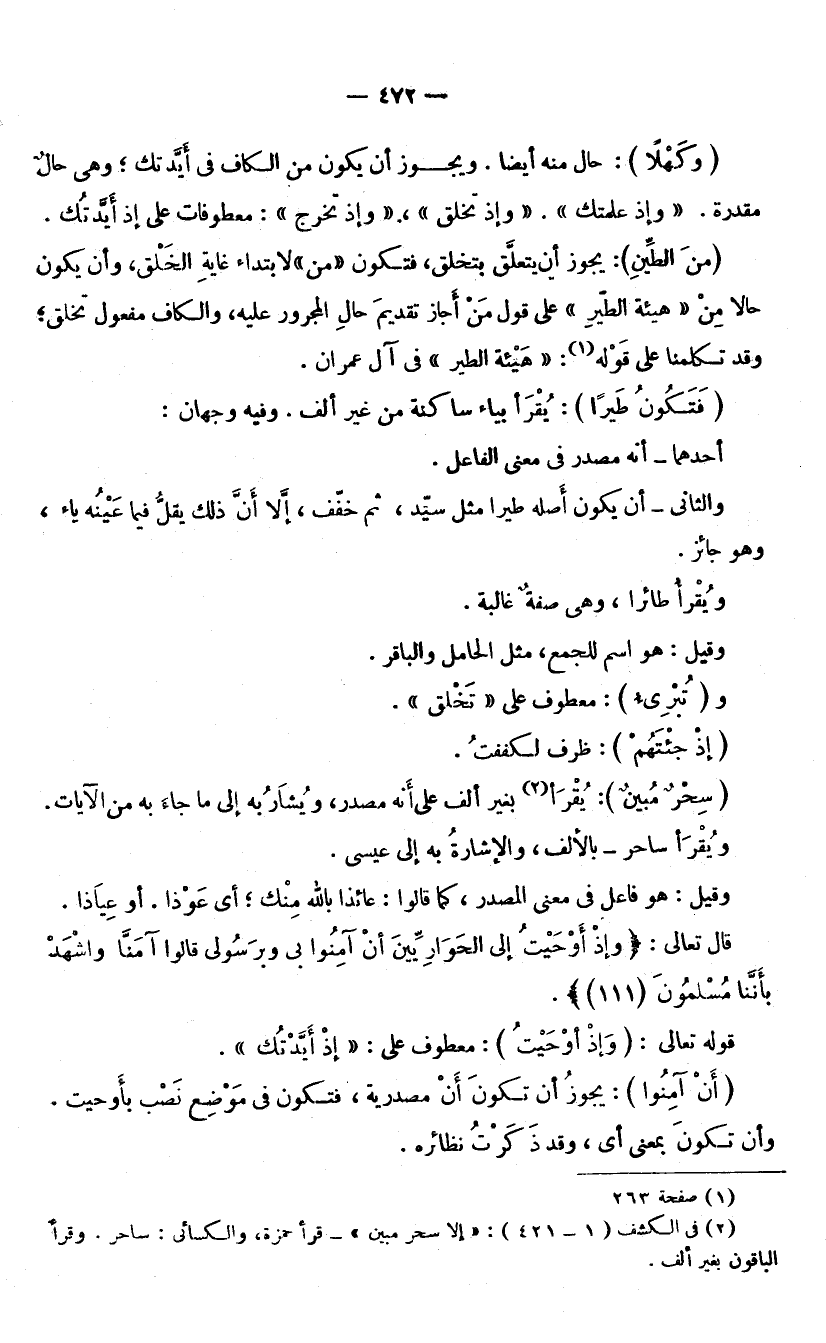 وَقِيلَ: هُوَ اسْمٌ لِلْجَمْعِ، مِثْلُ الْحَامِلِ وَالْبَاقِرِ. وَ (تُبْرِئُ) : مَعْطُوفٌ عَلَى «تَخْلُقُ» . (إِذْ جِئْتَهُمْ) : ظَرْفٌ لِكَفَفْتُ. (سِحْرٌ مُبِينٌ) : يُقْرَأُ بِغَيْرِ أَلِفٍ عَلَى أَنَّهُ مَصْدَرٌ، وَيُشَارُ بِهِ إِلَى مَا جَاءَ بِهِ مِنَ الْآيَاتِ.