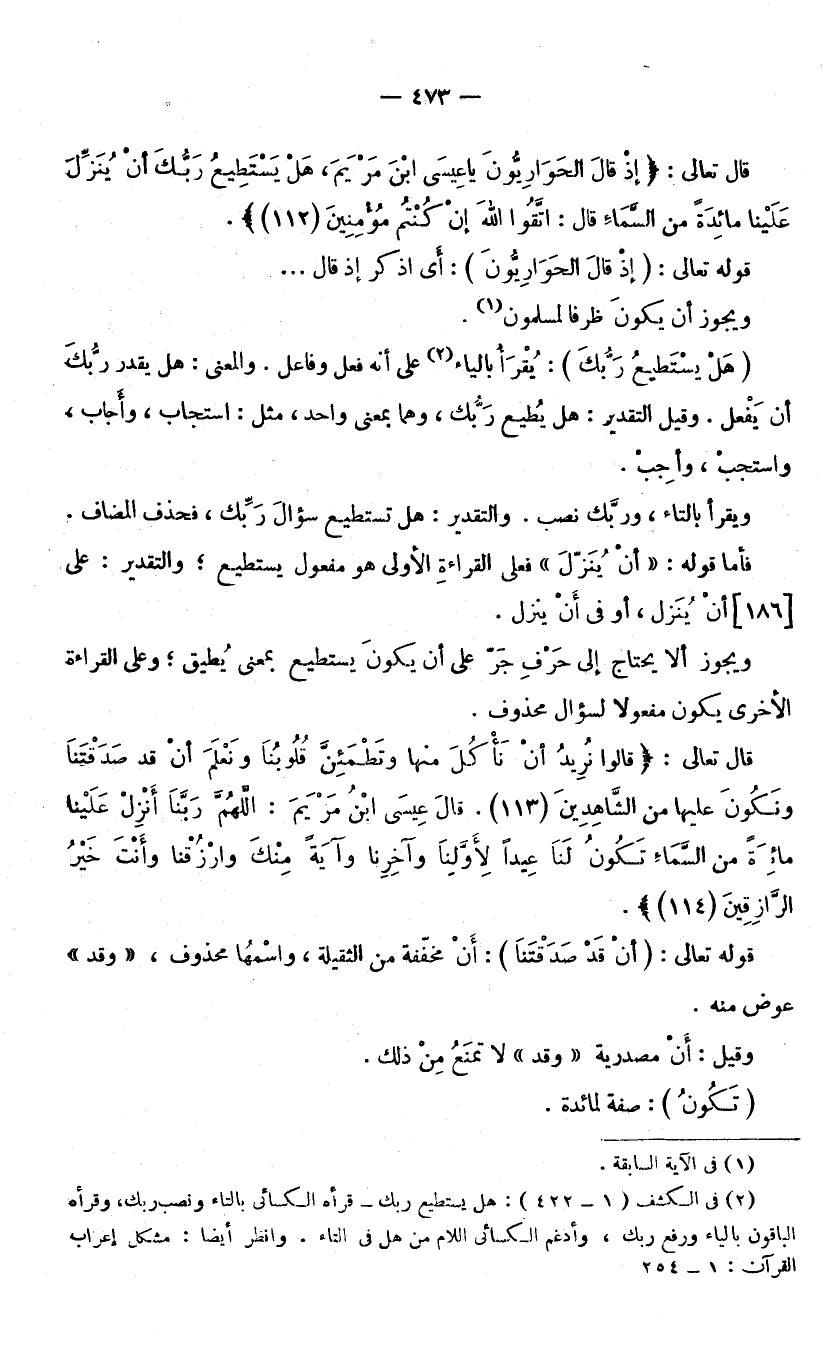 قَوْلُهُ تَعَالَى: (إِذْ قَالَ الْحَوَارِيُّونَ) : أَيِ: اذْكُرْ إِذْ قَالَ، وَيَجُوزُ أَنْ يَكُونَ ظَرْفًا لِـ «مُسْلِمُونَ» . (هَلْ يَسْتَطِيعُ رَبُّكَ) : يُقْرَأُ بِالْيَاءِ عَلَى أَنَّهُ فِعْلٌ وَفَاعِلٌ، وَالْمَعْنَى هَلْ يَقْدِرُ رَبُّكَ، أَوْ يَفْعَلُ. وَقِيلَ التَّقْدِيرُ: هَلْ يُطِيعُ رَبُّكَ، وَهَمَّا بِمَعْنًى وَاحِدٍ مِثْلُ اسْتَجَابَ، وَأَجَابَ، وَاسْتَجِبْ، وَأَجِبْ. وَيُقْرَأُ بِالتَّاءِ، وَرَبَّكَ نُصِبَ، وَالتَّقْدِيرُ: هَلْ تَسْتَطِيعُ سُؤَالَ رَبِّكَ، فَحُذِفَ الْمُضَافُ.