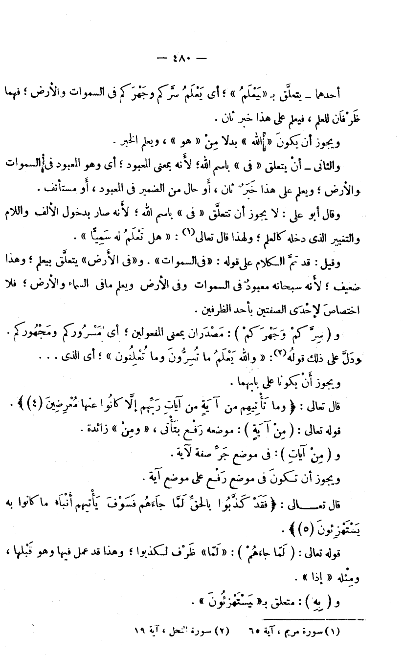 وَالثَّانِي: أَنْ يَتَعَلَّقَ «فِي» بَاسِمِ اللَّهِ؛ لِأَنَّهُ بِمَعْنَى الْمَعْبُودِ؛ أَيْ: وَهُوَ الْمَعْبُودُ فِي السَّمَاوَاتِ وَالْأَرْضِ، وَيَعْلَمُ عَلَى هَذَا خَبَرٌ ثَانٍ، أَوْ حَالٌ مِنَ الضَّمِيرِ فِي الْمَعْبُودِ، أَوْ مُسْتَأْنَفٌ، وَقَالَ أَبُو عَلِيٍّ: لَا يَجُوزُ أَنْ تَتَعَلَّقَ «فِي» بِاسْمِ اللَّهِ؛ لِأَنَّهُ صَارَ بِدُخُولِ الْأَلِفِ وَاللَّامِ وَالتَّغْيِيرِ الَّذِي دَخَلَهُ كَالْعَلَمِ، وَلِهَذَا قَالَ تَعَالَى: (هَلْ تَعْلَمُ لَهُ سَمِيًّا) [مَرْيَمَ: 65] وَقِيلَ: قَدْ تَمَّ الْكَلَامُ عَلَى قَوْلِهِ «فِي السَّمَاوَاتِ» . وَ «فِي الْأَرْضِ» يَتَعَلَّقُ بِـ «يَعْلَمُ» ؛ وَهَذَا ضَعِيفٌ؛ لِأَنَّهُ سُبْحَانَهُ مَعْبُودٌ فِي السَّمَاوَاتِ وَفِي الْأَرْضِ، وَيَعْلَمُ مَا فِي السَّمَاءِ وَالْأَرْضِ، فَلَا اخْتِصَاصَ لِإِحْدَى الصِّفَتَيْنِ بِأَحَدِ الظَّرْفَيْنِ.