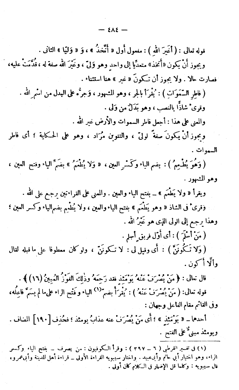 (وَهُوَ يُطْعِمُ) : بِضَمِّ الْيَاءِ وَكَسْرِ الْعَيْنِ؛ «وَلَا يُطْعَمُ» بِضَمِّ الْيَاءِ وَفَتْحِ الْعَيْنِ، وَهُوَ الْمَشْهُورُ، وَيُقْرَأُ «وَلَا يَطْعَمُ» بِفَتْحِ الْيَاءِ وَالْعَيْنِ، وَالْمَعْنَى عَلَى الْقِرَاءَتَيْنِ يَرْجِعُ عَلَى اللَّهِ.