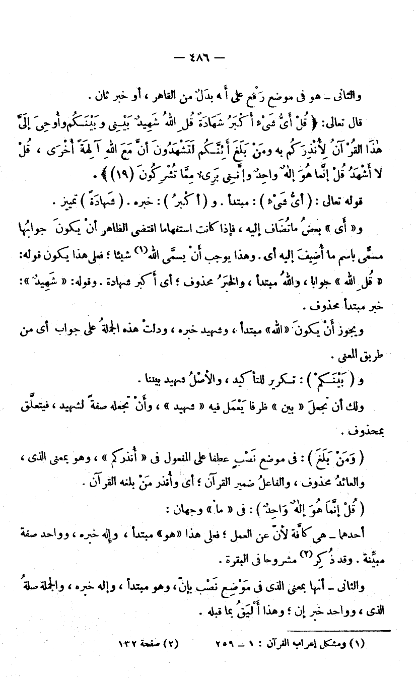 وَلَكَ أَنْ تَجْعَلَ «بَيْنَ» ظَرْفًا يَعْمَلُ فِيهِ شَهِيدٌ، وَأَنْ تَجْعَلَهُ صِفَةٌ لِشَهِيدٍ فَيَتَعَلَّقُ بِمَحْذُوفٍ. (وَمَنْ بَلَغَ) : فِي مَوْضِعِ نَصْبٍ عَطْفًا عَلَى الْمَفْعُولِ فِي «أُنْذِرَكُمْ» ، وَهُوَ بِمَعْنَى الَّذِي، وَالْعَائِدُ مَحْذُوفٌ، وَالْفَاعِلُ ضَمِيرُ الْقُرْآنِ؛ أَيْ: وَأُنْذِرَ مَنْ بَلَغَهُ الْقُرْآنُ.