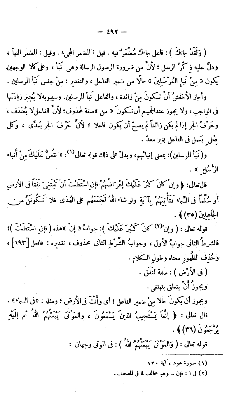 وَأَجَازَ الْأَخْفَشُ أَنْ تَكُونَ مِنْ زَائِدَةً، وَالْفَاعِلُ نَبَأُ الْمُرْسَلِينَ، وَسِيبَوَيْهِ لَا يُجِيزُ زِيَادَتَهَا فِي الْوَاجِبِ، وَلَا يَجُوزُ عِنْدَ الْجَمِيعِ أَنْ تَكُونَ مِنْ صِفَةٍ لِمَحْذُوفٍ؛ لِأَنَّ الْفَاعِلَ لَا يُحْذَفُ وَحَرْفُ الْجَرِّ إِذَا لَمْ يَكُنْ زَائِدًا لَمْ يَصِحَّ أَنْ يَكُونَ فَاعِلًا؛ لِأَنَّ حَرْفَ الْجَرِّ يُعَدِّي، وَكُلُّ فِعْلٍ يَعْمَلُ فِي الْفَاعِلِ بِغَيْرِ مُعَدٍّ، وَ (نَبَأِ الْمُرْسَلِينَ) : بِمَعْنَى إِنْبَائِهِمْ، وَيَدُلُّ عَلَى ذَلِكَ قَوْلُهُ تَعَالَى: (نَقُصُّ عَلَيْكَ مِنْ أَنْبَاءِ الرُّسُلِ) [هُودٍ: 120] .