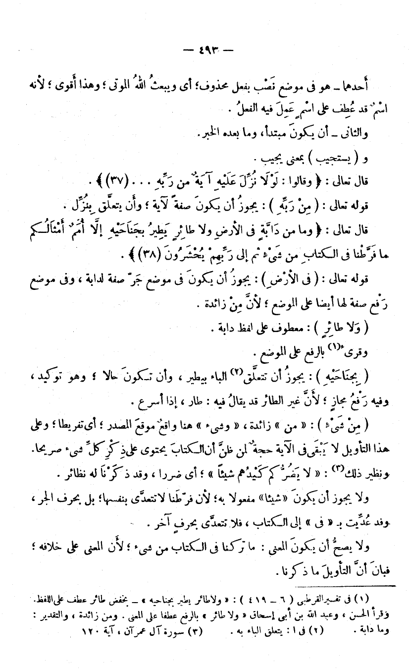قَوْلُهُ تَعَالَى: (فِي الْأَرْضِ) : يَجُوزُ أَنْ يَكُونَ فِي مَوْضِعِ جَرٍّ صِفَةٌ لِدَابَّةٍ، وَفِي مَوْضِعِ رَفْعِ صِفَةٍ لَهَا أَيْضًا عَلَى الْمَوْضِعِ؛ لِأَنَّ مِنْ زَائِدَةٌ. (وَلَا طَائِرٍ) : مَعْطُوفٌ عَلَى لَفْظِ دَابَّةٍ، وَقُرِئَ بِالرَّفْعِ عَلَى الْمَوْضِعِ. (بِجَنَاحَيْهِ) : يَجُوزُ أَنْ تَتَعَلَّقَ الْبَاءُ بِيَطِيرُ، وَأَنْ تَكُونَ حَالًا، وَهُوَ تَوْكِيدٌ، وَفِيهِ رَفْعُ مَجَازٍ؛ لِأَنَّ غَيْرَ الطَّائِرِ قَدْ يُقَالُ فِيهِ طَارَ إِذَا أَسْرَعَ. (مِنْ شَيْءٍ) : «مِنْ» زَائِدَةٌ؛ «وَشَيْءٌ» هُنَا وَاقِعٌ مَوْقِعَ الْمَصْدَرِ؛ أَيْ: تَفْرِيطًا، وَعَلَى هَذَا التَّأْوِيلِ لَا يَبْقَى فِي الْآيَةِ حُجَّةٌ لِمَنْ ظَنَّ أَنَّ الْكِتَابَ يَحْتَوِي عَلَى ذِكْرِ كُلِّ شَيْءٍ صَرِيحًا.