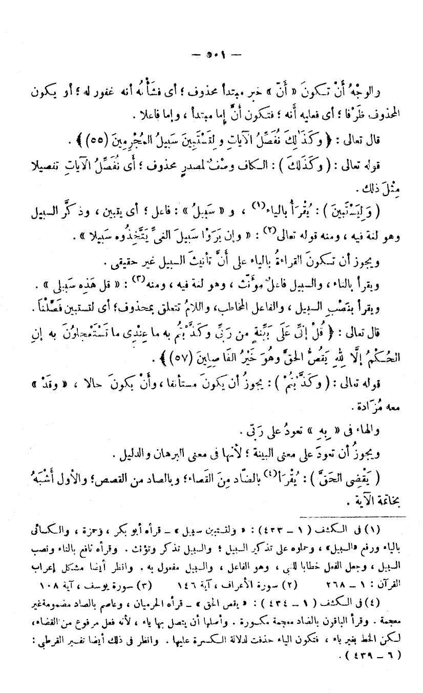 مِثْلُ ذَلِكَ: «وَلِيَسْتَبِينَ» : يُقْرَأُ بِالْيَاءِ، وَ «سَبِيلُ» فَاعِلٌ؛ أَيْ: «يَتَبَيَّنَ» ، وَذَكَرَ السَّبِيلَ، وَهُوَ لُغَةٌ فِيهِ، وَمِنْهُ قَوْلُهُ تَعَالَى: (وَإِنْ يَرَوْا سَبِيلَ الْغَيِّ يَتَّخِذُوهُ سَبِيلًا) [الْأَعْرَافِ: 146] .