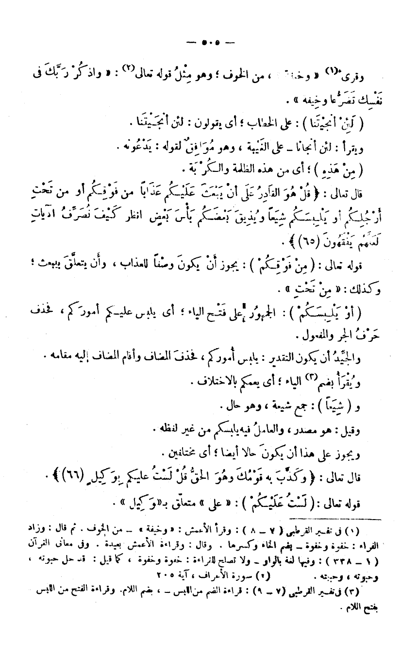 قَوْلُهُ تَعَالَى: (مِنْ فَوْقِكُمْ) : يَجُوزُ أَنْ يَكُونَ وَصْفًا لِلْعَذَابِ، وَأَنْ يَتَعَلَّقَ بِيَبْعَثَ، وَكَذَلِكَ (مِنْ تَحْتِ) . (أَوْ يَلْبِسَكُمْ) : الْجُمْهُورُ عَلَى فَتْحِ الْيَاءِ؛ أَيْ: يَلْبِسَ عَلَيْكُمْ أُمُورَكُمْ، فَحُذِفَ حَرْفُ الْجَرِّ وَالْمَفْعُولِ، وَالْجَيِّدُ أَنْ يَكُونَ التَّقْدِيرُ: يَلْبِسَ أُمُورَكُمْ، فَحُذِفَ الْمُضَافُ، وَأَقَامَ الْمُضَافَ إِلَيْهِ مَقَامَهُ.