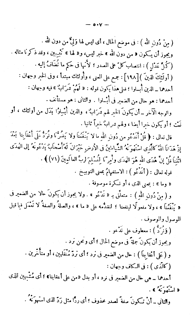 (مَا) : بِمَعْنَى الَّذِي، أَوْ نَكِرَةٌ مَوْصُوفَةٌ. وَ (مِنْ دُونِ اللَّهِ) : مُتَعَلِّقٌ بِنَدْعُو، وَلَا يَجُوزُ أَنْ يَكُونَ حَالًا مِنَ الضَّمِيرِ فِي (يَنْفَعُنَا) ، وَلَا مَفْعُولًا لِيَنْفَعُنَا، لِتَقَدُّمِهِ عَلَى «مَا» وَالصِّلَةُ وَالصِّفَةُ لَا تَعْمَلُ فِيمَا قَبْلَ الْمَوْصُولِ وَالْمَوْصُوفِ. (وَنُرَدُّ) : مَعْطُوفٌ عَلَى نَدْعُو، وَيَجُوزُ أَنْ يَكُونَ جُمْلَةً فِي مَوْضِعِ الْحَالِ؛ أَيْ: وَنَحْنُ نُرَدُّ.