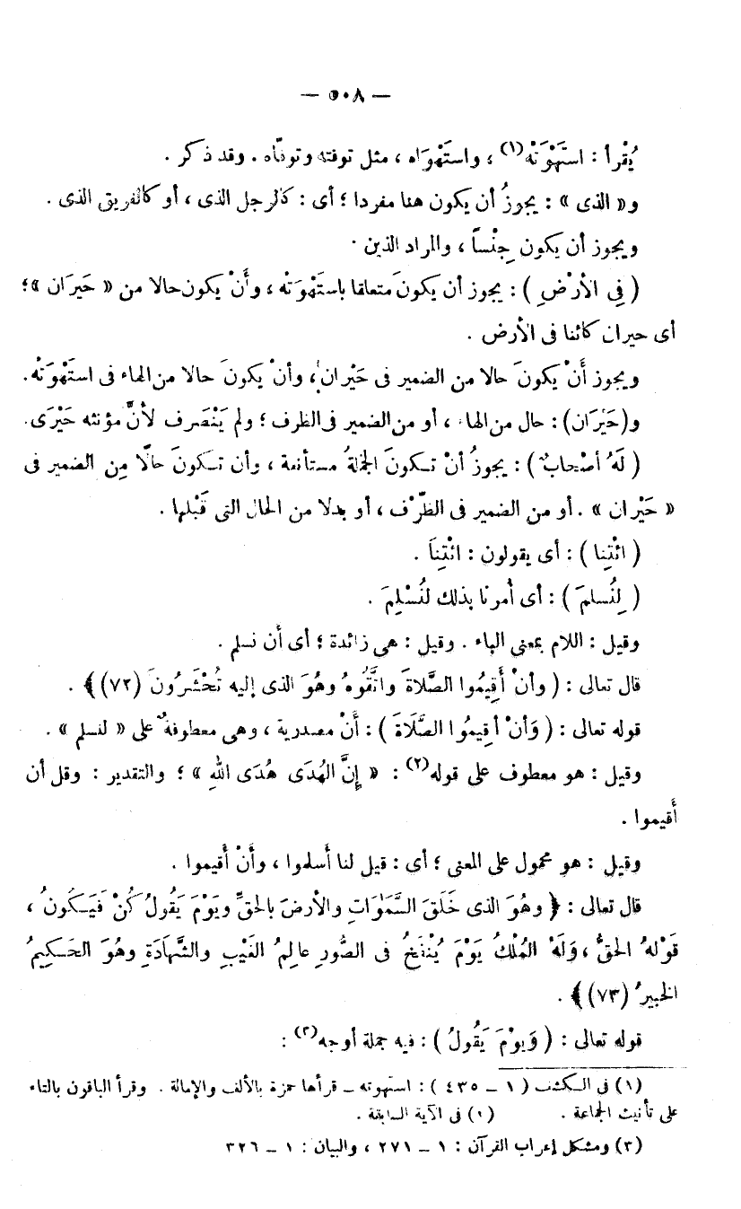 قَوْلُهُ تَعَالَى: (وَأَنْ أَقِيمُوا الصَّلَاةَ) : أَنْ مَصْدَرِيَّةٌ، وَهِيَ مَعْطُوفَةٌ عَلَى لِنُسْلِمَ، وَقِيلَ: هُوَ مَعْطُوفٌ عَلَى قَوْلِهِ: (إِنَّ الْهُدَى هُدَى اللَّهِ) ، وَالتَّقْدِيرُ: وَقُلْ أَنْ أَقِيمُوا، وَقِيلَ: هُوَ مَحْمُولٌ عَلَى الْمَعْنَى؛ أَيْ: قِيلَ: لَنَا أَسْلِمُوا وَأَنْ أَقِيمُوا.
