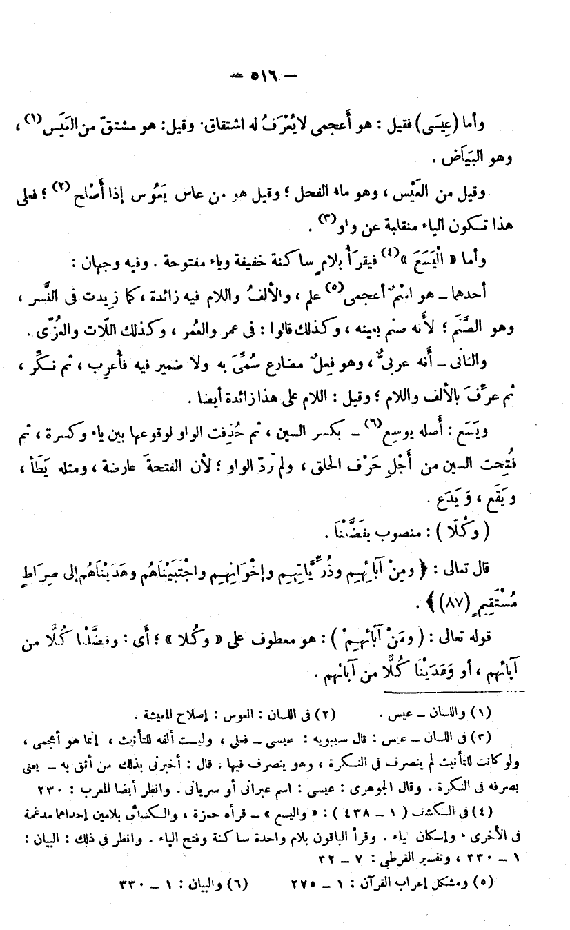 وَأَمَّا «الْيَسَعُ» فَيُقْرَأُ بِلَامٍ سَاكِنَةٍ خَفِيفَةٍ، وَيَاءٍ مَفْتُوحَةٍ، وَفِيهِ وَجْهَانِ: أَحَدُهُمَا: هُوَ اسْمٌ أَعْجَمِيٌّ عَلَمٌ، وَالْأَلِفُ وَاللَّامُ فِيهِ زَائِدَةٌ، كَمَا زِيدَتْ فِي النَّسْرِ، وَهُوَ الصَّنَمُ؛ لِأَنَّهُ صَنَمٌ بِعَيْنِهِ، وَكَذَلِكَ قَالُوا فِي عُمَرَ وَالْعُمَرِ، وَكَذَلِكَ اللَّاتُ وَالْعُزَّى.