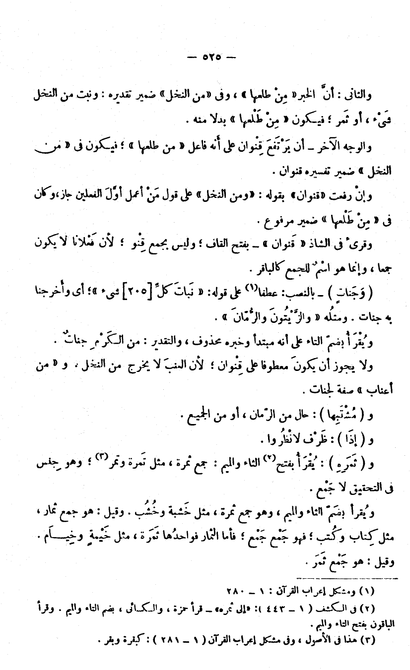 وَالْوَجْهُ الْآخَرُ: أَنْ يَرْتَفِعَ قِنْوَانٌ عَلَى أَنَّهُ فَاعِلٌ مِنْ طَلْعِهَا، فَيَكُونُ فِي مِنَ النَّخْلِ ضَمِيرٌ تَفْسِيرُهُ قِنْوَانٌ، وَإِنْ رَفَعْتَ قِنْوَانٌ بِقَوْلِهِ: «وَمِنَ النَّخْلِ» عَلَى قَوْلِ مَنْ أَعْمَلَ أَوَّلَ الْفِعْلَيْنِ جَازَ، وَكَانَ فِي مِنْ طَلْعِهَا ضَمِيرٌ مَرْفُوعٌ، وَقُرِئَ فِي الشَّاذِّ: قَنْوَانٌ بِفَتْحِ الْقَافِ؛ وَلَيْسَ بِجَمْعِ قِنْوٍ؛ لِأَنَّ فِعْلَانًا لَا يَكُونُ جَمْعًا، وَإِنَّمَا هُوَ اسْمٌ لِلْجَمْعِ كَالْبَاقِرِ.