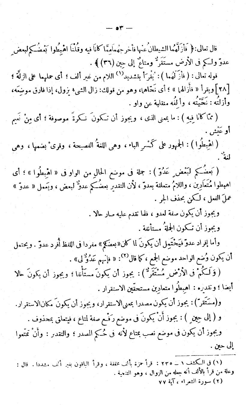(مِمَّا كَانَا فِيهِ) : مَا بِمَعْنَى الَّذِي، وَيَجُوزُ أَنْ تَكُونَ نَكِرَةً مَوْصُوفَةً أَيْ مِنْ نَعِيمٍ أَوْ عَيْشٍ: اهْبِطُوا، الْجُمْهُورُ عَلَى كَسْرِ الْبَاءِ وَهِيَ اللُّغَةُ الْفَصِيحَةُ، وَقُرِئَ بِضَمِّهَا، وَهِيَ لُغَةٌ. (بَعْضُكُمْ لِبَعْضٍ عَدُوٌّ) : جُمْلَةٌ فِي مَوْضِعِ الْحَالِ مِنَ الْوَاوِ فِي اهْبِطُوا ; أَيِ اهْبِطُوا مُتَعَادِينَ وَاللَّامُ مُتَعَلِّقَةٌ بِعَدُوٍّ ; لِأَنَّ التَّقْدِيرَ بَعْضُكُمْ عَدُوٌّ لِبَعْضٍ وَيَعْمَلُ عَدُوٌّ عَمَلَ الْفِعْلِ لَكِنْ بِحَذْفِ الْجَرِّ وَيَجُوزُ أَنْ يَكُونَ صِفَةً لِعَدُوٍّ ; فَلَمَّا تَقَدَّمَ عَلَيْهِ صَارَ حَالًا.