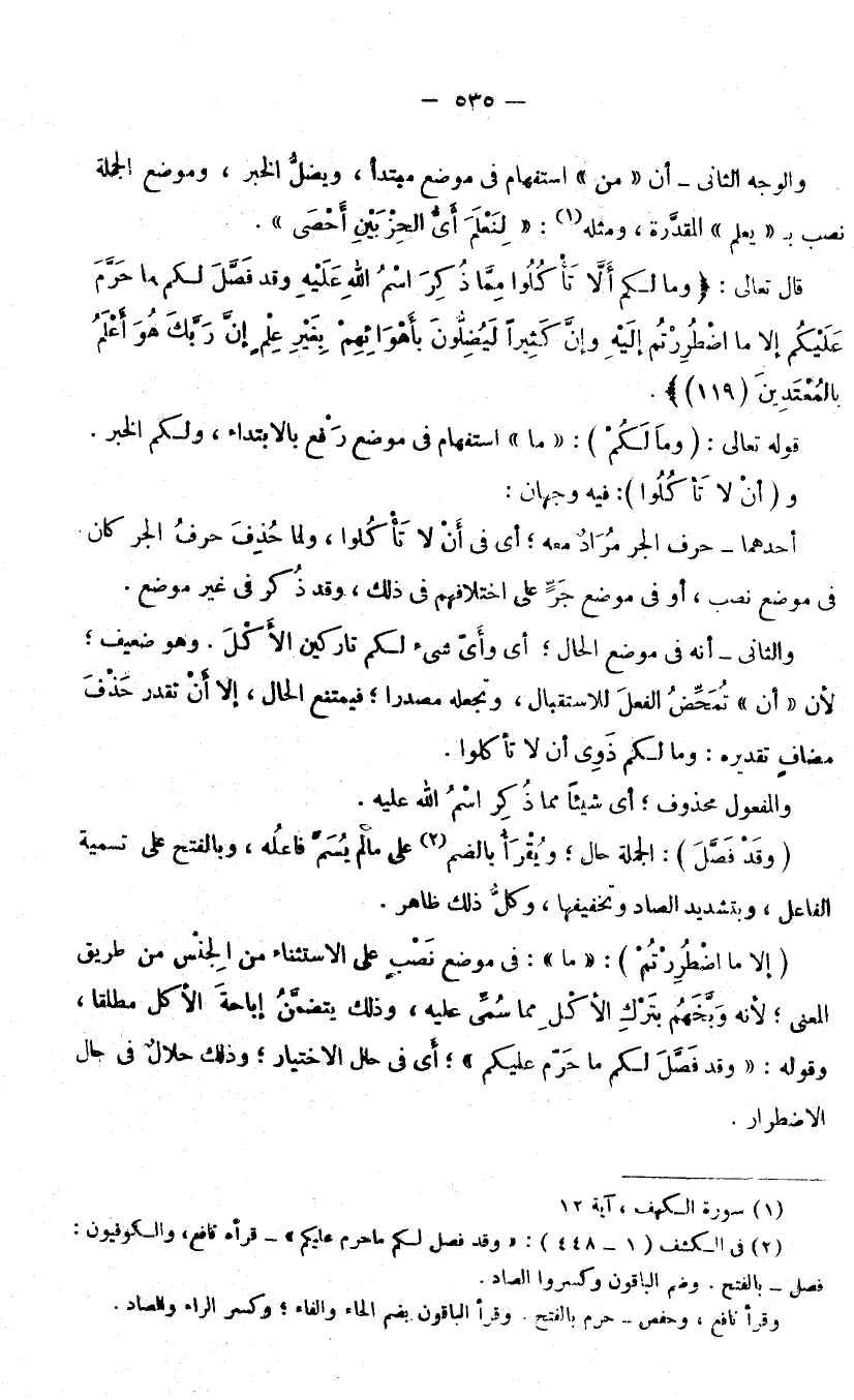 وَالثَّانِي: أَنَّهُ فِي مَوْضِعِ الْحَالِ؛ أَيْ: وَأَيُّ شَيْءٍ لَكُمْ تَارِكِينَ الْأَكْلَ، وَهُوَ ضَعِيفٌ؛ لِأَنَّ «أَنْ» تُمَحِّضُ الْفِعْلَ لِلِاسْتِقْبَالِ، وَتَجْعَلُهُ مَصْدَرًا، فَيَمْتَنِعُ الْحَالُ إِلَّا أَنْ تُقَدِّرَ حَذْفَ مُضَافٍ تَقْدِيرُهُ: وَمَا لَكُمْ ذَوِي أَنْ لَا تَأْكُلُوا. وَالْمَفْعُولُ مَحْذُوفٌ؛ أَيْ: شَيْئًا مِمَّا ذُكِرَ اسْمُ اللَّهِ عَلَيْهِ.