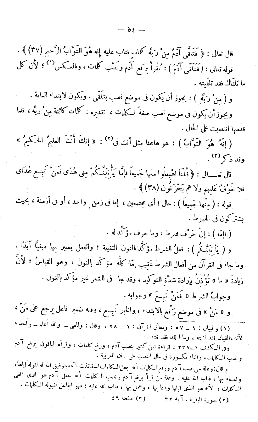 قَوْلُهُ تَعَالَى: (فَتَلَقَّى آدَمُ) : يُقْرَأُ بِرَفْعِ آدَمَ وَنَصْبِ كَلِمَاتٍ، وَبِالْعَكْسِ ; لِأَنَّ كُلَّ مَا تَلَقَّاكَ فَقَدْ تَلَقَّيْتَهُ. وَ (مِنْ رَبِّهِ) : يَجُوزُ أَنْ يَكُونَ فِي مَوْضِعِ نَصْبٍ بِتَلَقَّى. وَيَكُونُ لِابْتِدَاءِ الْغَايَةِ.