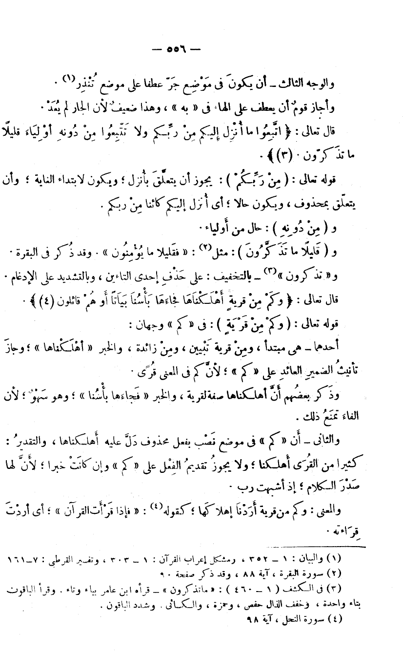 وَالثَّانِي: أَنَّ «كَمْ» فِي مَوْضِعِ نَصْبٍ بِفِعْلٍ مَحْذُوفٍ، دَلَّ عَلَيْهِ أَهْلَكْنَاهَا، وَالتَّقْدِيرُ: كَثِيرًا مِنَ الْقُرَى أَهْلَكْنَا، وَلَا يَجُوزُ تَقْدِيمُ الْفِعْلِ عَلَى «كَمْ» وَإِنْ كَانَتْ خَبَرًا؛ لِأَنَّ لَهَا صَدْرُ الْكَلَامِ إِذْ أَشْبَهَتْ رُبَّ، وَالْمَعْنَى: وَكَمْ مِنْ قَرْيَةٍ أَرَدْنَا إِهْلَاكَهَا كَقَوْلِهِ: (فَإِذَا قَرَأْتَ الْقُرْآنَ) [النَّحْلِ: 98] : أَيْ: أَرَدْتَ قِرَاءَتَهُ.