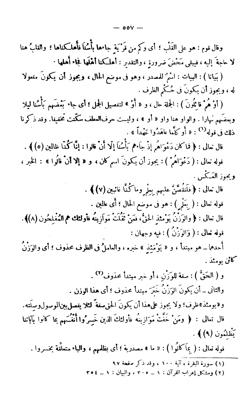 وَقَالَ قَوْمٌ: هُوَ عَلَى الْقَلْبِ؛ أَيْ: وَكَمْ مِنْ قَرْيَةٍ جَاءَهَا بَأْسُنَا فَأَهْلَكْنَاهَا، وَالْقَلْبُ هُنَا لَا حَاجَةَ إِلَيْهِ، فَيَبْقَى مَحْضَ ضَرُورَةٍ، وَالتَّقْدِيرُ: أَهْلَكْنَا أَهْلَهَا فَجَاءَ أَهْلُهَا. (بَيَاتًا) : الْبَيَاتُ اسْمٌ لِلْمَصْدَرِ، وَهُوَ فِي مَوْضِعِ الْحَالِ، وَيَجُوزُ أَنْ يَكُونَ مَفْعُولًا لَهُ، وَيَجُوزُ أَنْ يَكُونَ فِي حُكْمِ الظَّرْفِ. (أَوْ هُمْ قَائِلُونَ) : الْجُمْلَةُ حَالٌ، وَ «أَوْ» لِتَفْصِيلِ الْجُمَلِ؛ أَيْ: جَاءَ بَعْضُهُمْ بَأْسُنَا لَيْلًا وَبَعْضُهُمْ نَهَارًا، وَالْوَاوُ هُنَا وَاوُ «أَوْ» وَلَيْسَتْ حَرْفَ الْعَطْفِ سُكِّنَتْ تَخْفِيفًا، وَقَدْ ذَكَرْنَا ذَلِكَ فِي قَوْلِهِ: (أَوَكُلَّمَا عَاهَدُوا عَهْدًا) [الْبَقَرَةِ: 100] .