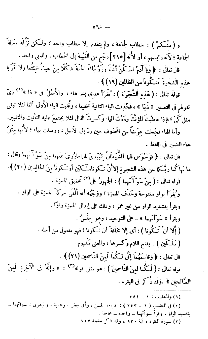 قَوْلُهُ تَعَالَى: (مِنْ سَوْآتِهِمَا) : الْجُمْهُورُ عَلَى تَحْقِيقِ الْهَمْزَةِ. وَيُقْرَأُ بِوَاوٍ مَفْتُوحَةٍ، وَحَذْفِ الْهَمْزَةِ، وَوَجْهُهُ أَنَّهُ أَلْقَى حَرَكَةَ الْهَمْزَةِ عَلَى الْوَاوِ، وَيُقْرَأُ بِتَشْدِيدِ الْوَاوِ مِنْ غَيْرِ هَمْزٍ، وَذَلِكَ عَلَى إِبْدَالِ الْهَمْزَةِ وَاوًا. وَيُقْرَأُ «سَوْأَتُهُمَا» عَلَى التَّوْحِيدِ، وَهُوَ جِنْسٌ. (إِلَّا أَنْ تَكُونَا) : أَيْ إِلَّا مَخَافَةَ أَنْ تَكُونَا، فَهُوَ مَفْعُولٌ مِنْ أَجْلِهِ. (مَلَكَيْنِ) : بِفَتْحِ اللَّامِ وَكَسْرِهَا، وَالْمَعْنَى مَفْهُومٌ.