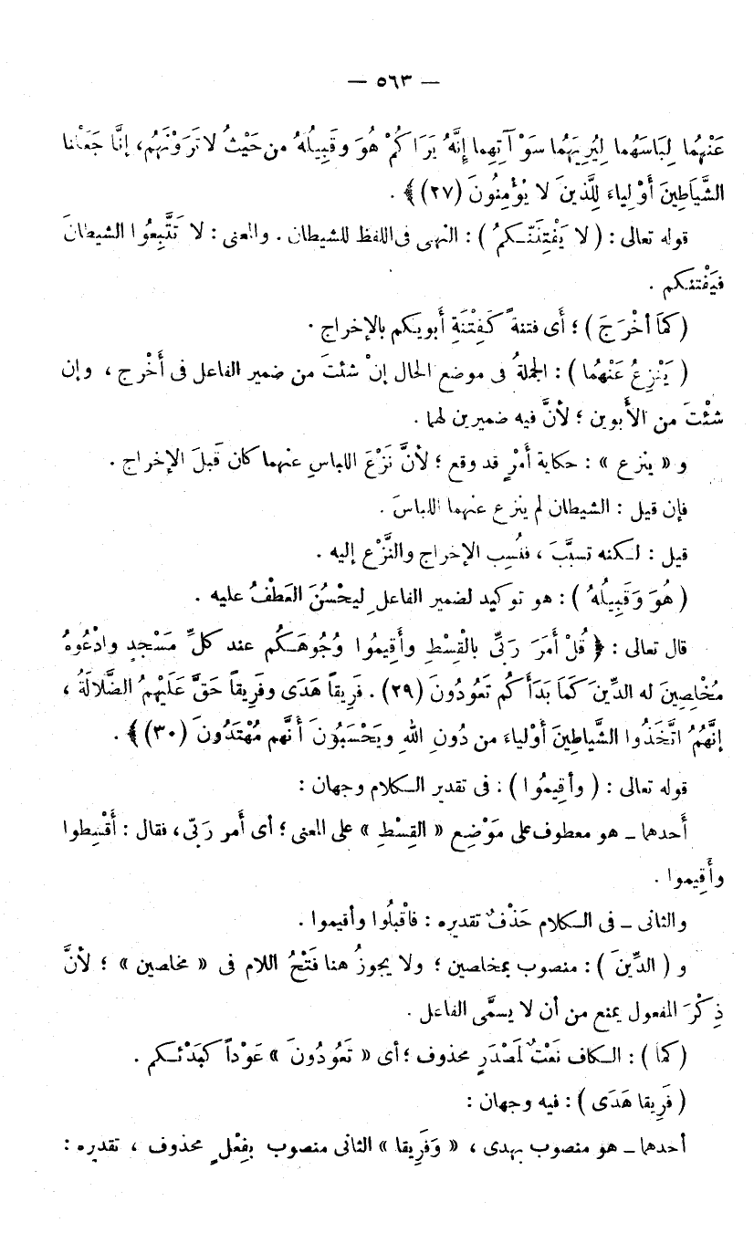 قَوْلُهُ تَعَالَى: (وَأَقِيمُوا) : فِي تَقْدِيرِ الْكَلَامِ وَجْهَانِ: أَحَدُهُمَا: هُوَ مَعْطُوفٌ عَلَى مَوْضِعِ «الْقِسْطِ» عَلَى الْمَعْنَى؛ أَيْ: أَمَرَ رَبِّي فَقَالَ أَقْسِطُوا وَأَقِيمُوا. وَالثَّانِي: فِي الْكَلَامِ حَذْفٌ تَقْدِيرُهُ: فَأَقْبِلُوا وَأَقِيمُوا. وَ (الدِّينَ) : مَنْصُوبٌ بِمُخْلِصِينَ، وَلَا يَجُوزُ هَنَا فَتْحُ اللَّامِ فِي «مُخْلِصِينَ» : لِأَنَّ ذِكْرَ الْمَفْعُولِ يَمْنَعُ مِنْ أَنْ لَا يُسَمَّى الْفَاعِلُ. (كَمَا) : الْكَافُ نَعْتٌ لِمَصْدَرٍ مَحْذُوفٍ؛ أَيْ: تَعُودُونَ عَوْدًا كَبَدْئِكُمْ. (فَرِيقًا هَدَى) : فِيهِ وَجْهَانِ: أَحَدُهُمَا: هُوَ مَنْصُوبٌ بِهَدَى، «وَفَرِيقًا» الثَّانِي مَنْصُوبٌ بِفِعْلٍ مَحْذُوفٍ تَقْدِيرُهُ: