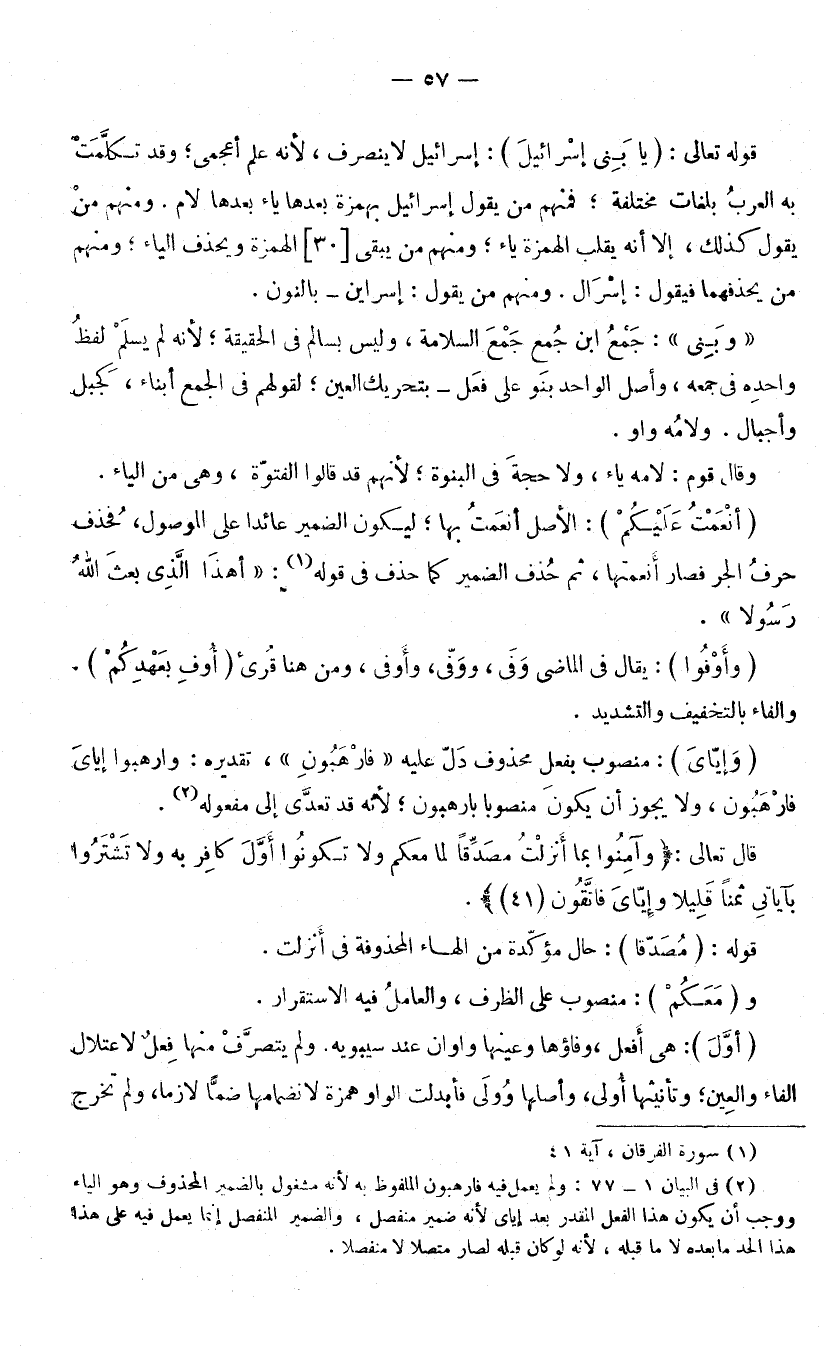 (أَنْعَمْتُ عَلَيْكُمْ) : الْأَصْلُ أَنْعَمْتُ بِهَا لِيَكُونَ الضَّمِيرُ عَائِدًا عَلَى الْمَوْصُولِ، فَحُذِفَ حَرْفُ الْجَرِّ، فَصَارَ أَنْعَمْتُهَا، ثُمَّ حُذِفَ الضَّمِيرُ كَمَا حُذِفَ فِي قَوْلِهِ (أَهَذَا الَّذِي بَعَثَ اللَّهُ رَسُولًا) . (وَأَوْفُوا) : يُقَالُ فِي الْمَاضِي وَفَى، وَوَفَّى، وَمِنْ هُنَا قُرِئَ: (أُوفِ بِعَهْدِكُمْ) : وَالْفَاءُ بِالتَّخْفِيفِ وَالتَّشْدِيدِ. (وَإِيَّايَ) : مَنْصُوبٌ بِفِعْلٍ مَحْذُوفٍ دَلَّ عَلَيْهِ فَارْهَبُونِ، تَقْدِيرُهُ: وَارْهَبُوا إِيَّايَ فَارْهَبُونِ، وَلَا يَجُوزُ أَنْ يَكُونَ مَنْصُوبًا بِـ (ارْهَبُونِ) ; لِأَنَّهُ قَدْ تَعَدَّى إِلَى مَفْعُولِهِ.