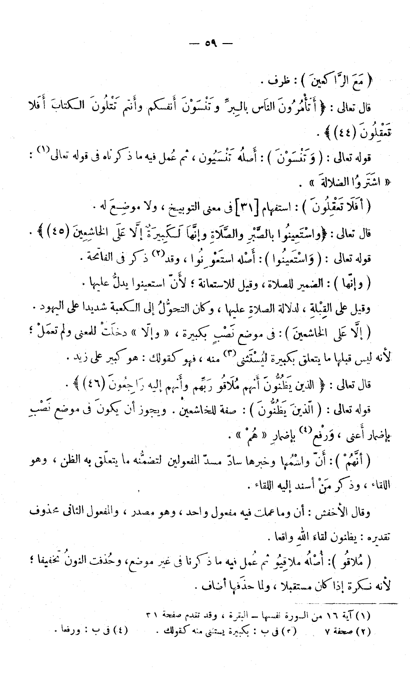 قَوْلُهُ تَعَالَى: (وَاسْتَعِينُوا) : أَصْلُهُ اسْتَعْوِنُوا، وَقَدْ ذُكِرَ فِي الْفَاتِحَةِ. وَأَنَّهَا الضَّمِيرُ لِلصَّلَاةِ، وَقِيلَ لِلِاسْتِعَانَةِ ; لِأَنَّ اسْتَعِينُوا يَدُلُّ عَلَيْهَا، وَقِيلَ عَلَى الْقِبْلَةِ لِدَلَالَةِ الصَّلَاةِ عَلَيْهَا، وَكَانَ التَّحَوُّلُ إِلَى الْكَعْبَةِ شَدِيدًا عَلَى الْيَهُودِ: إِلَّا عَلَى الْخَاشِعِينَ فِي مَوْضِعِ نَصْبٍ بِكَبِيرَةٍ، وَإِلَّا دَخَلَتْ لِلْمَعْنَى وَلَمْ تَعْمَلْ ; لِأَنَّهُ لَيْسَ قَبْلَهَا مَا يَتَعَلَّقُ بِكَبِيرَةٍ لِيُسْتَثْنَى مِنْهُ فَهُوَ كَقَوْلِكَ هُوَ كَبِيرٌ عَلَى زَيْدٍ.