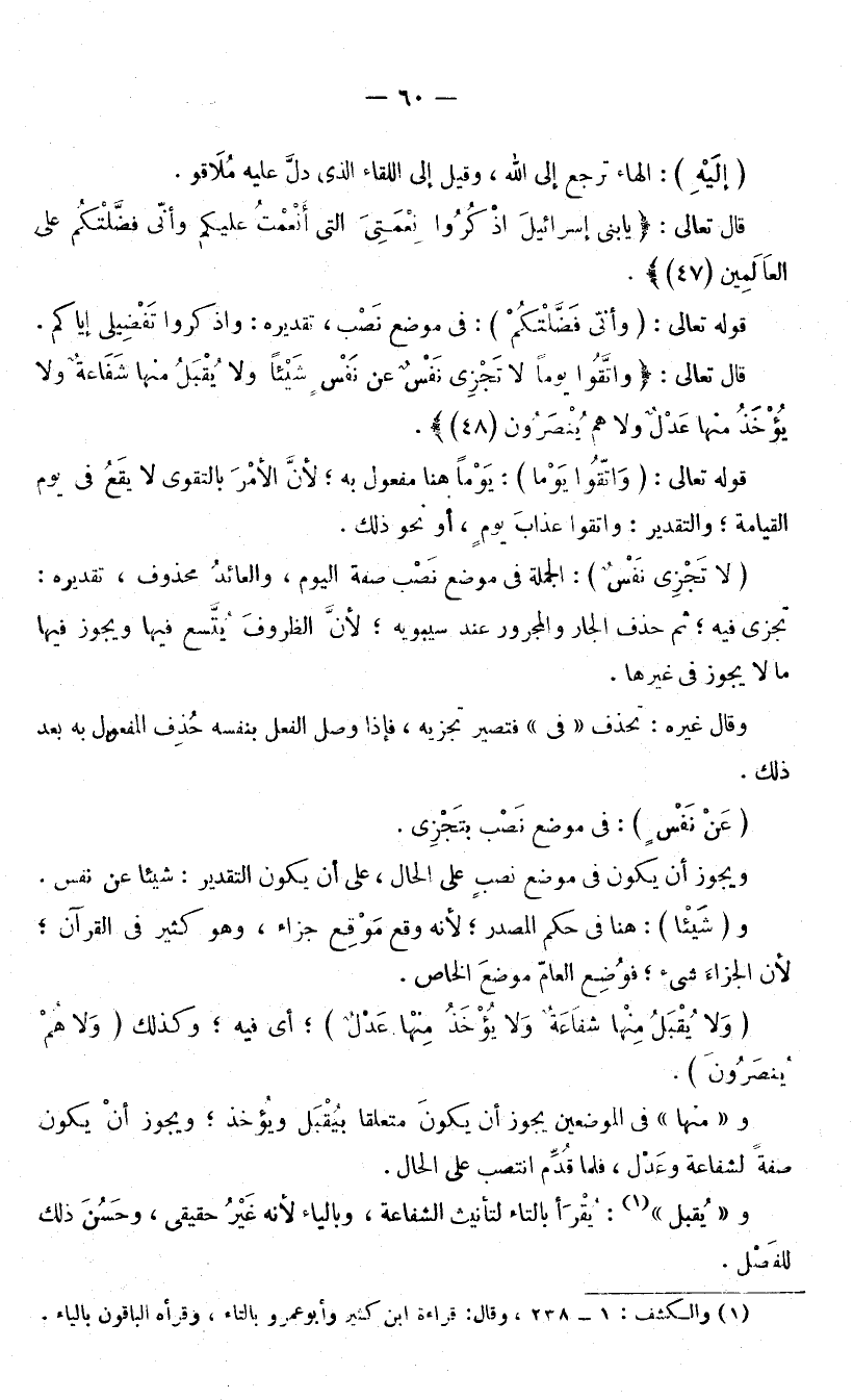قَوْلُهُ تَعَالَى: (وَلَا يُقْبَلُ مِنْهَا شَفَاعَةٌ وَلَا يُؤْخَذُ مِنْهَا عَدْلٌ) : أَيْ فِيهِ ; وَكَذَلِكَ: (وَلَا هُمْ يُنْصَرُونَ) . وَ (مِنْهَا) : فِي الْمَوْضِعَيْنِ يَجُوزُ أَنْ يَكُونَ مُتَعَلِّقًا بِـ (يُقْبَلُ) وَيُؤْخَذُ، وَيَجُوزُ أَنْ يَكُونَ صِفَةً لِشَفَاعَةٍ وَعَدْلٍ، فَلَمَّا قَدِ انْتَصَبَ عَلَى الْحَالِ.
