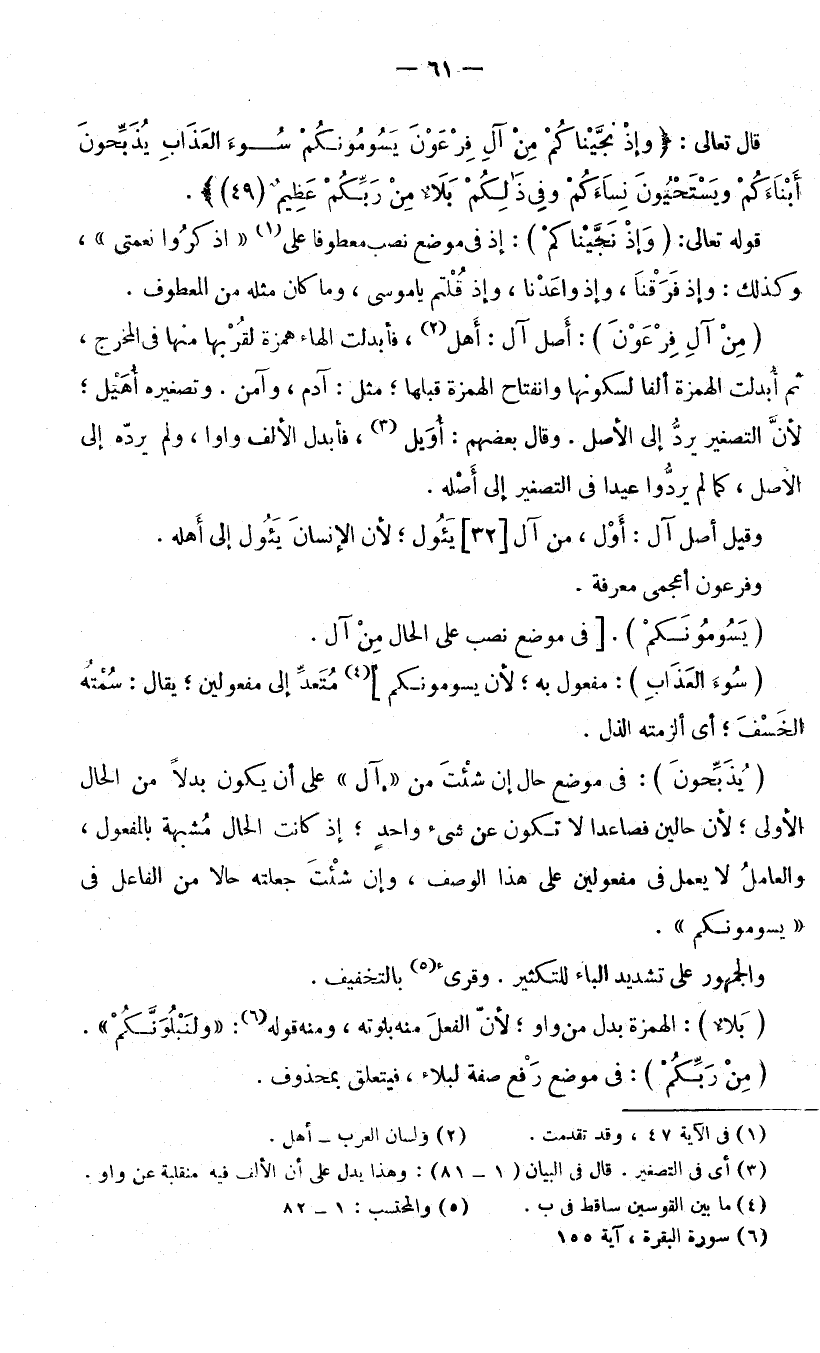قَوْلُهُ تَعَالَى: (وَإِذْ نَجَّيْنَاكُمْ) : إِذْ فِي مَوْضِعِ نَصْبٍ مَعْطُوفًا عَلَى (اذْكُرُوا نِعْمَتِيَ) [الْبَقَرَةِ: 50] ، (وَإِذْ وَاعَدْنَا) [الْبَقَرَةِ: 51] ، وَإِذْ قُلْتُمْ يَامُوسَى، وَمَا كَانَ مِثْلُهُ مِنَ الْعُطُوفِ. (مِنْ آلِ فِرْعَوْنَ) : أَصْلُ آلٍ أَهْلٌ، فَأُبْدِلَتِ الْهَاءُ هَمْزَةً لِقُرْبِهَا مِنْهَا فِي الْمَخْرَجِ، ثُمَّ أُبْدِلَتِ الْهَمْزَةُ أَلِفًا لِسُكُونِهَا وَانْفِتَاحِ الْهَمْزَةِ قَبْلَهَا مِثْلُ آدَمَ وَآمَنَ، وَتَصْغِيرُهُ أُهَيْلٌ ; لِأَنَّ التَّصْغِيرَ يَرُدُّ إِلَى الْأَصْلِ، وَقَالَ بَعْضُهُمْ: أُوَيْلٌ، فَأَبْدَلَ الْأَلِفَ وَاوًا، وَلَمْ يَرُدَّهُ إِلَى الْأَصْلِ كَمَا لَمْ يَرُدُّوا عِيدًا فِي التَّصْغِيرِ إِلَى أَصْلِهِ.