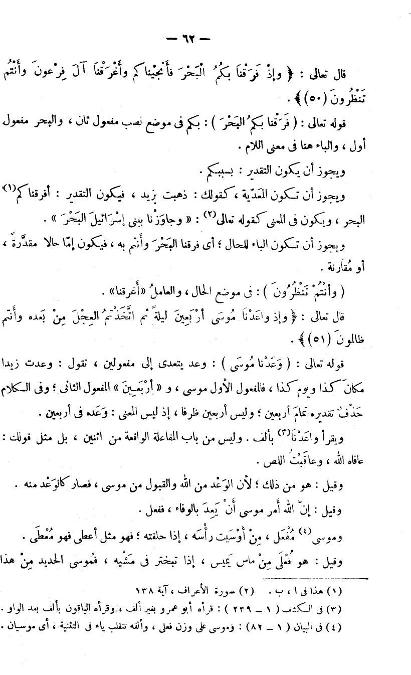 قَوْلُهُ تَعَالَى: (وَاعَدْنَا مُوسَى) : وَعَدَ يَتَعَدَّى إِلَى مَفْعُولَيْنِ، تَقُولُ وَعَدْتُ زِيدًا مَكَانَ كَذَا، وَيَوْمَ كَذَا، فَالْمَفْعُولُ الْأَوَّلُ مُوسَى، وَ «أَرْبَعِينَ» الْمَفْعُولُ الثَّانِي، وَفِي الْكَلَامِ حَذْفٌ تَقْدِيرُهُ تَمَامَ أَرْبَعِينَ، وَلَيْسَ أَرْبَعِينَ ظَرْفًا، إِذْ لَيْسَ الْمَعْنَى وَعَدَهُ فِي أَرْبَعِينَ.