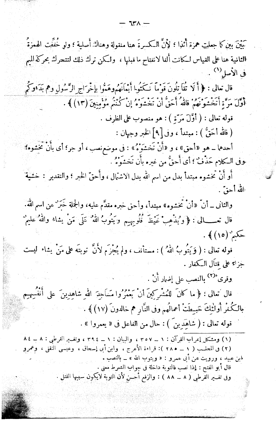 (فَاللَّهُ أَحَقُّ) : مُبْتَدَأٌ، وَفِي الْخَبَرِ وَجْهَانِ: أَحَدُهُمَا: هُوَ «أَحَقُّ» وَ «أَنْ تَخْشَوْهُ» فِي مَوْضِعِ نَصْبٍ، أَوْ جَرٍّ؛ أَيْ: بِأَنْ تَخْشَوْهُ، وَفِي الْكَلَامِ حَذْفٌ؛ أَيْ: أَحَقُّ مِنْ غَيْرِهِ بِأَنْ تَخْشَوْهُ، أَوْ أَنْ تَخْشَوْهُ مُبْتَدَأٌ بَدَلٌ مِنِ اسْمِ اللَّهِ بَدَلَ الِاشْتِمَالِ، وَأَحَقُّ الْخَبَرُ، وَالتَّقْدِيرُ: خَشْيَةُ اللَّهِ أَحَقُّ. وَالثَّانِي: أَنَّ «أَنْ تَخْشَوْهُ» مُبْتَدَأٌ، وَأَحَقُّ خَبَرُهُ مُقَدَّمٌ عَلَيْهِ، وَالْجُمْلَةُ خَبَرٌ عَنِ اسْمِ اللَّهِ.