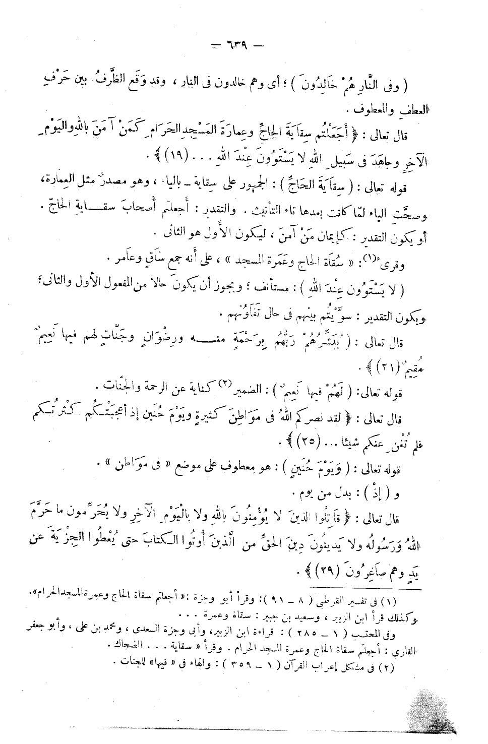 قَوْلُهُ تَعَالَى: (سِقَايَةَ الْحَاجِّ) : الْجُمْهُورُ عَلَى سِقَايَةٍ بِالْيَاءِ، وَهُوَ مَصْدَرٌ مِثْلُ الْعِمَارَةِ، صَحَّتِ الْيَاءُ لَمَّا كَانَتْ بَعْدَهَا تَاءُ التَّأْنِيثِ؛ وَالتَّقْدِيرُ: أَجَعَلْتُمْ أَصْحَابَ سِقَايَةِ الْحَاجِّ، أَوْ يَكُونُ التَّقْدِيرُ: كَإِيمَانِ مَنْ آمَنَ؛ لِيَكُونَ الْأَوَّلُ هُوَ الثَّانِي.