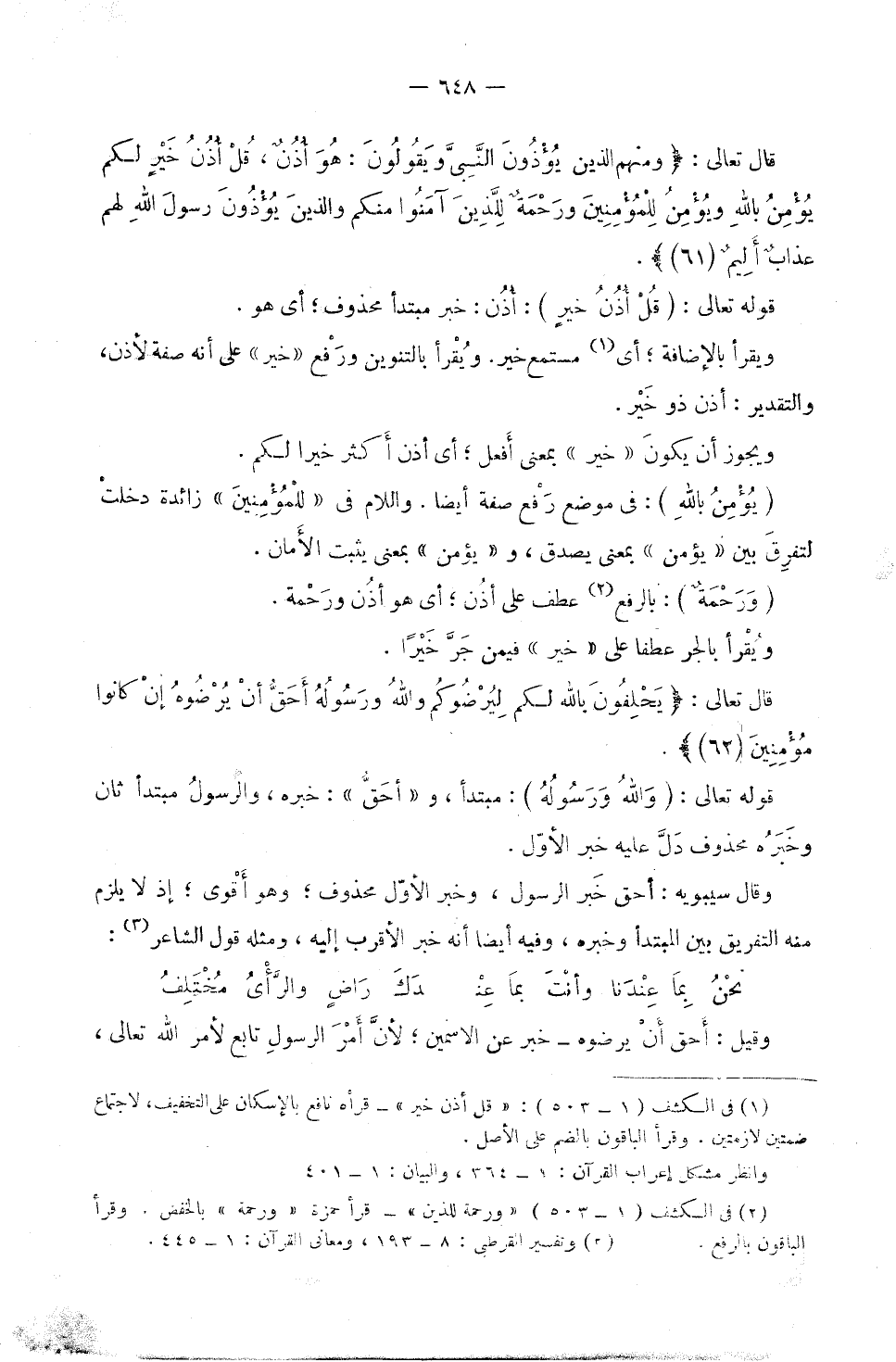 قَوْلُهُ تَعَالَى: (قُلْ أُذُنُ خَيْرٍ) : أُذُنُ: خَبَرُ مُبْتَدَأٍ مَحْذُوفٍ؛ أَيْ: هُوَ.