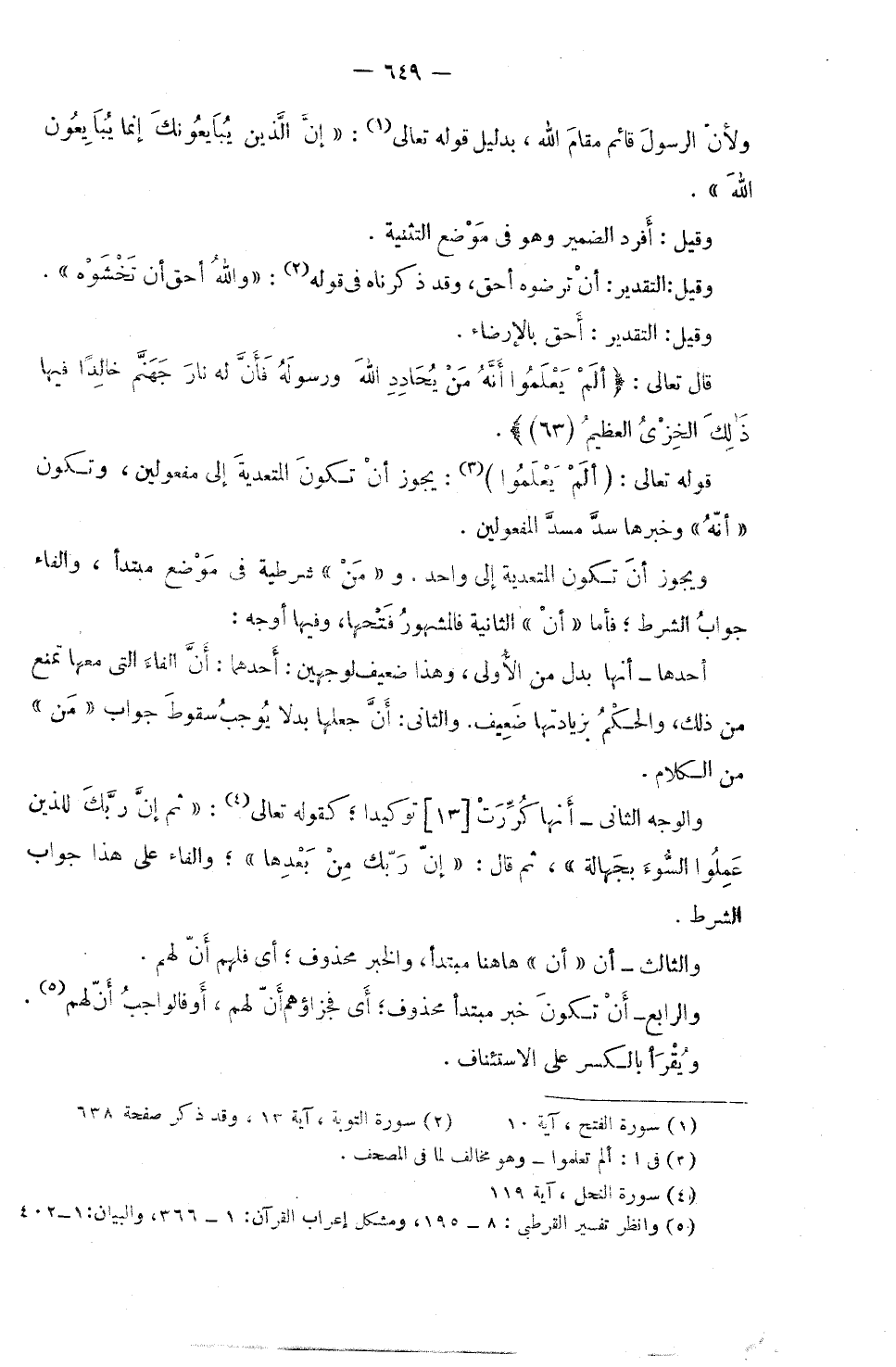 وَيَجُوزُ أَنْ تَكُونَ الْمُتَعَدِّيَةَ إِلَى وَاحِدٍ. وَ «مِنْ» شَرْطِيَّةٌ مَوْضِعُ مُبْتَدَأٍ، وَالْفَاءُ جَوَابُ الشَّرْطِ؛ فَأَمَّا «أَنَّ» الثَّانِيَةُ فَالْمَشْهُورُ فَتْحُهَا، وَفِيهَا أَوْجُهٌ: أَحَدُهَا: أَنَّهَا بَدَلٌ مِنَ الْأُولَى، وَهَذَا ضَعِيفٌ لِوَجْهَيْنِ: أَحَدُهُمَا: أَنَّ الْفَاءَ الَّتِي مَعَهَا تَمَنَعُ مِنْ ذَلِكَ، وَالْحُكْمُ بِزِيَادَتِهَا ضَعِيفٌ. وَالثَّانِي: أَنَّ جَعْلَهَا بَدَلًا يُوجِبُ سُقُوطَ جَوَابِ «مَنْ» مِنَ الْكَلَامِ. وَالْوَجْهُ الثَّانِي: أَنَّهَا كُرِّرَتْ تَوْكِيدًا؛ كَقَوْلِهِ تَعَالَى: (ثُمَّ إِنَّ رَبَّكَ لِلَّذِينَ عَمِلُوا السُّوءَ بِجَهَالَةٍ) [النَّحْلِ: 119] ثُمَّ قَالَ: «إِنَّ رَبَّكَ مِنْ بَعْدِهَا» ، وَالْفَاءُ عَلَى هَذَا جَوَابُ الشَّرْطِ. وَالثَّالِثُ: أَنَّ «أَنَّ» هَاهُنَا مُبْتَدَأٌ، وَالْخَبَرُ مَحْذُوفٌ؛ أَيْ: فَلَهُمْ أَنَّ لَهُمْ. وَالرَّابِعُ: أَنْ تَكُونَ خَبَرَ مُبْتَدَأٍ مَحْذُوفٍ؛ أَيْ فَجَزَاؤُهُمْ أَنَّ لَهُمْ، أَوْ فَالْوَاجِبُ لَهُمْ، وَيُقْرَأُ بِالْكَسْرِ عَلَى الِاسْتِئْنَافِ.
