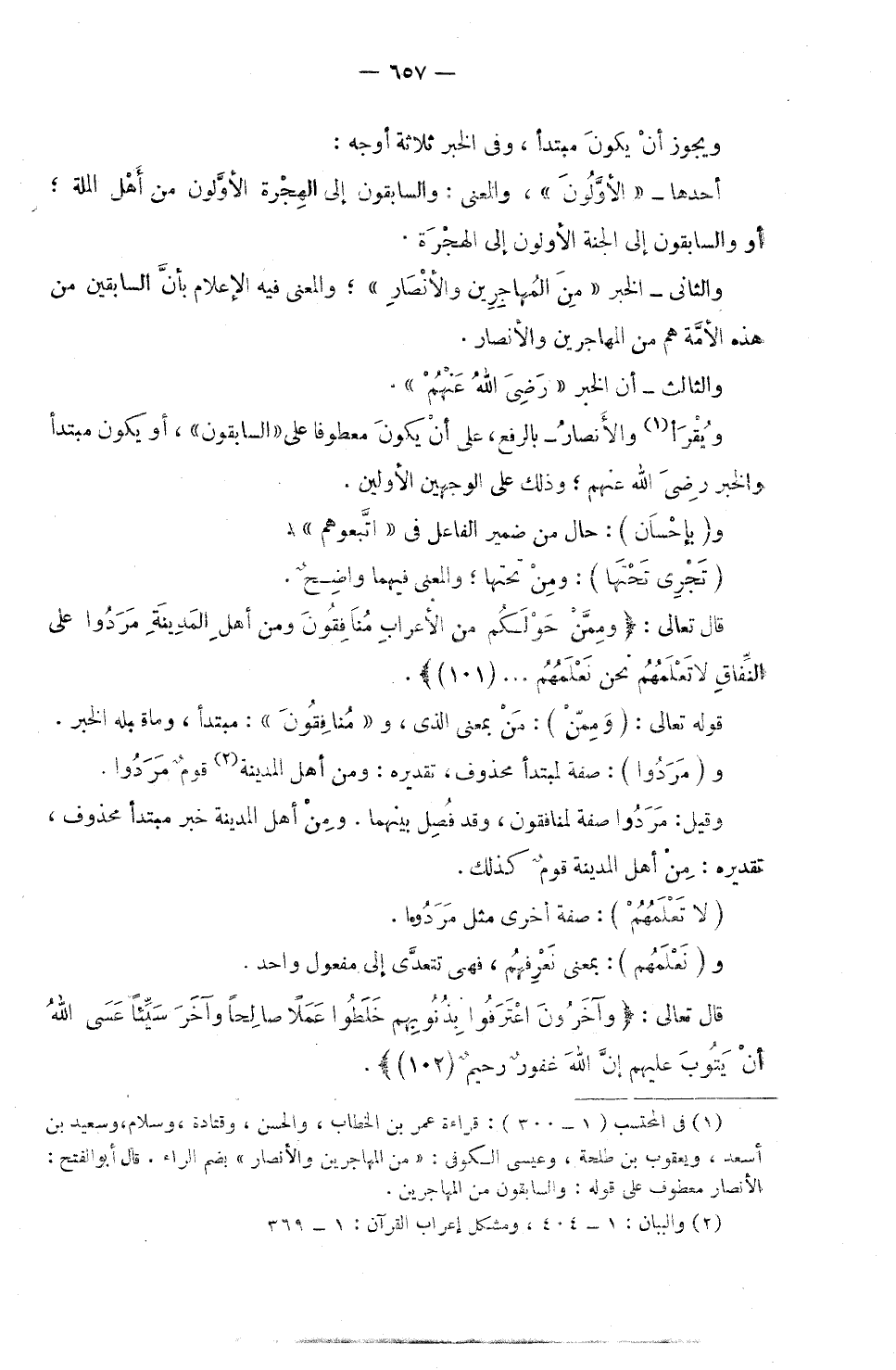 وَيَجُوزُ أَنْ يَكُونَ مُبْتَدَأً، وَفِي الْخَبَرِ ثَلَاثَةُ أَوْجُهٍ: أَحَدُهَا: «الْأَوَّلُونَ» وَالْمَعْنَى: وَالسَّابِقُونَ إِلَى الْهِجْرَةِ الْأَوَّلُونَ مِنْ أَهْلِ الْمِلَّةِ، أَوْ وَالسَّابِقُونَ إِلَى الْجَنَّةِ الْأَوَّلُونَ إِلَى الْهِجْرَةِ. وَالثَّانِي: الْخَبَرُ «مِنَ الْمُهَاجِرِينَ وَالْأَنْصَارِ» وَالْمَعْنَى فِيهِ الْإِعْلَامُ بِأَنَّ السَّابِقِينَ مِنْ هَذِهِ الْأُمَّةِ هُمْ مِنَ الْمُهَاجِرِينَ وَالْأَنْصَارِ.