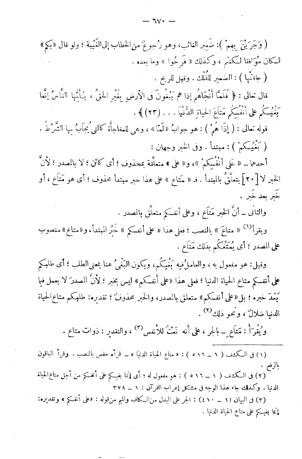قَوْلُهُ تَعَالَى: (إِذَا هُمْ) : هُوَ جَوَابٌ (لِمَا) ، وَهِيَ لِلْمُفَاجَأَةِ كَالَّتِي يُجَابُ بِهَا الشَّرْطُ. (بَغْيُكُمْ) مُبْتَدَأٌ. وَفِي الْخَبَرِ وَجْهَانِ: أَحَدُهُمَا. «عَلَى أَنْفُسِكُمْ» ، وَعَلَى مُتَعَلِّقَةٌ بِمَحْذُوفٍ ; أَيْ كَائِنٌ ; لَا بِالْمَصْدَرِ ; لِأَنَّ الْخَبَرَ لَا يَتَعَلَّقُ بِالْمُبْتَدَأِ. فَـ «مَتَاعُ» عَلَى هَذَا خَبَرُ مُبْتَدَأٍ مَحْذُوفٍ ; أَيْ هُوَ مَتَاعٌ، أَوْ خَبَرٌ بَعْدَ خَبَرٍ. وَالثَّانِي: أَنَّ الْخَبَرَ مَتَاعٌ، وَعَلَى أَنْفُسِكُمْ